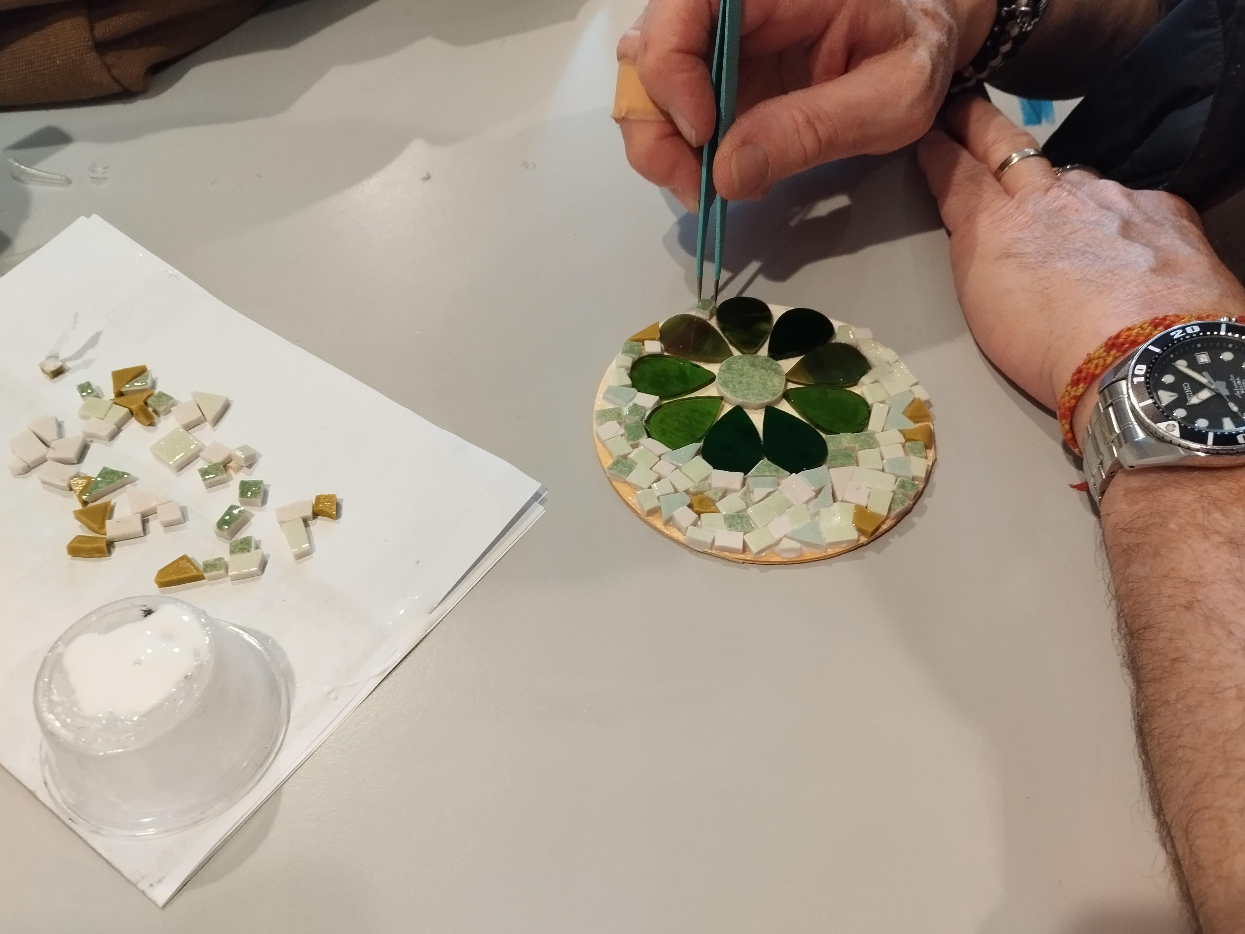 gratuit => apporter son propre matériel : carreaux de faïence, pince japonaise, coupe-verre, pince ouvre coupe, marteau, support en bois, colle, réglet, feutre non permanent, torchon, joint