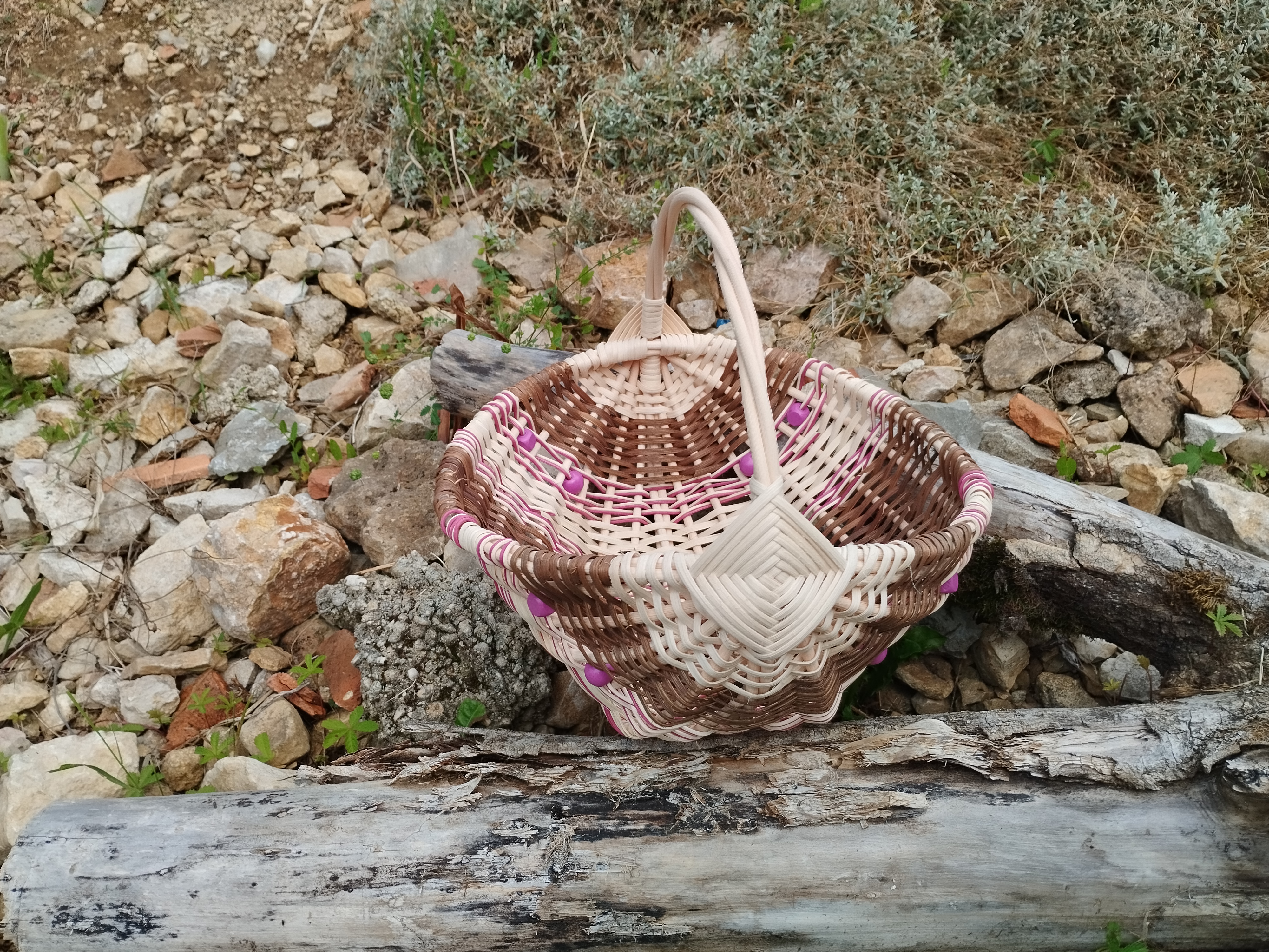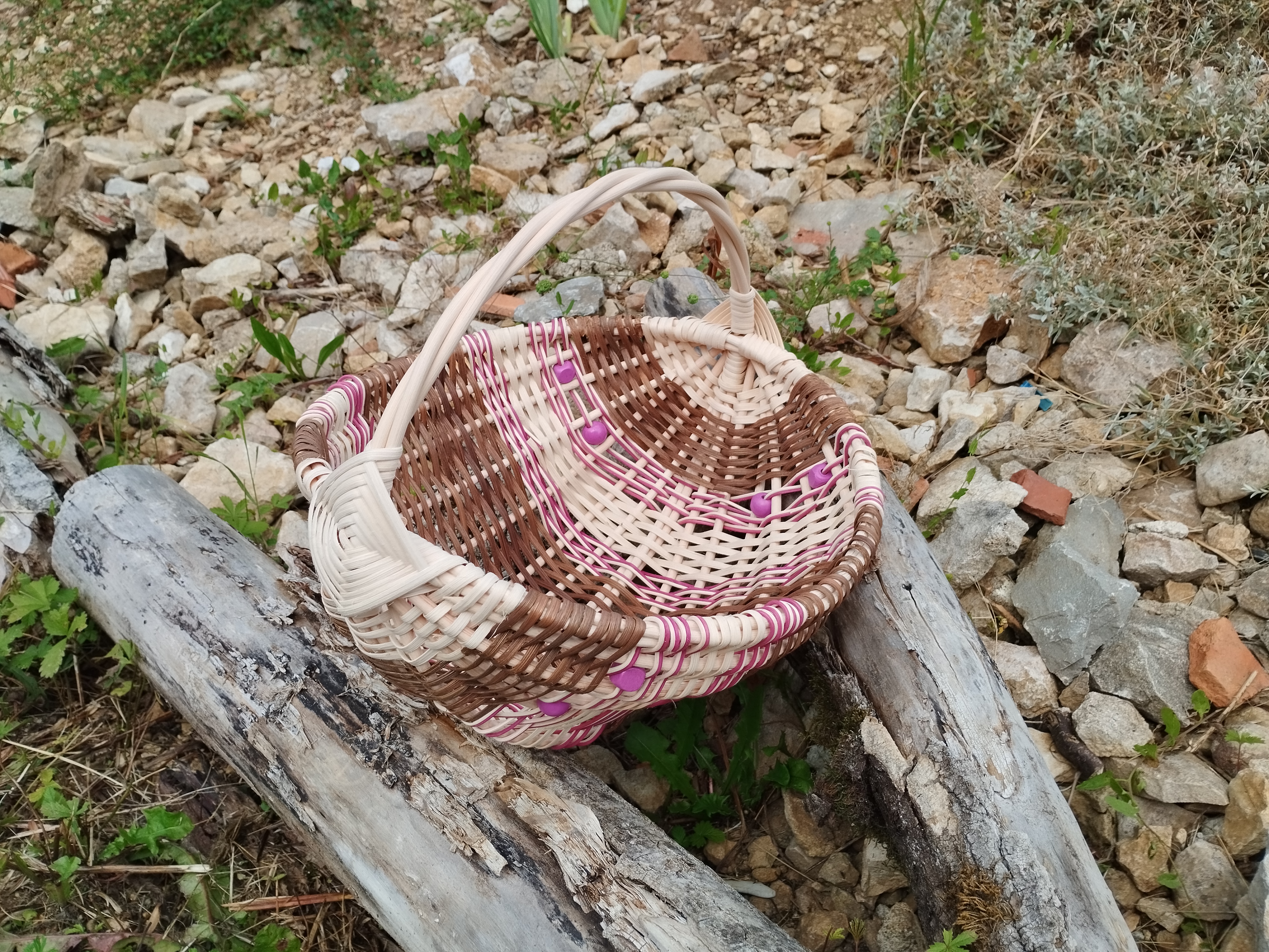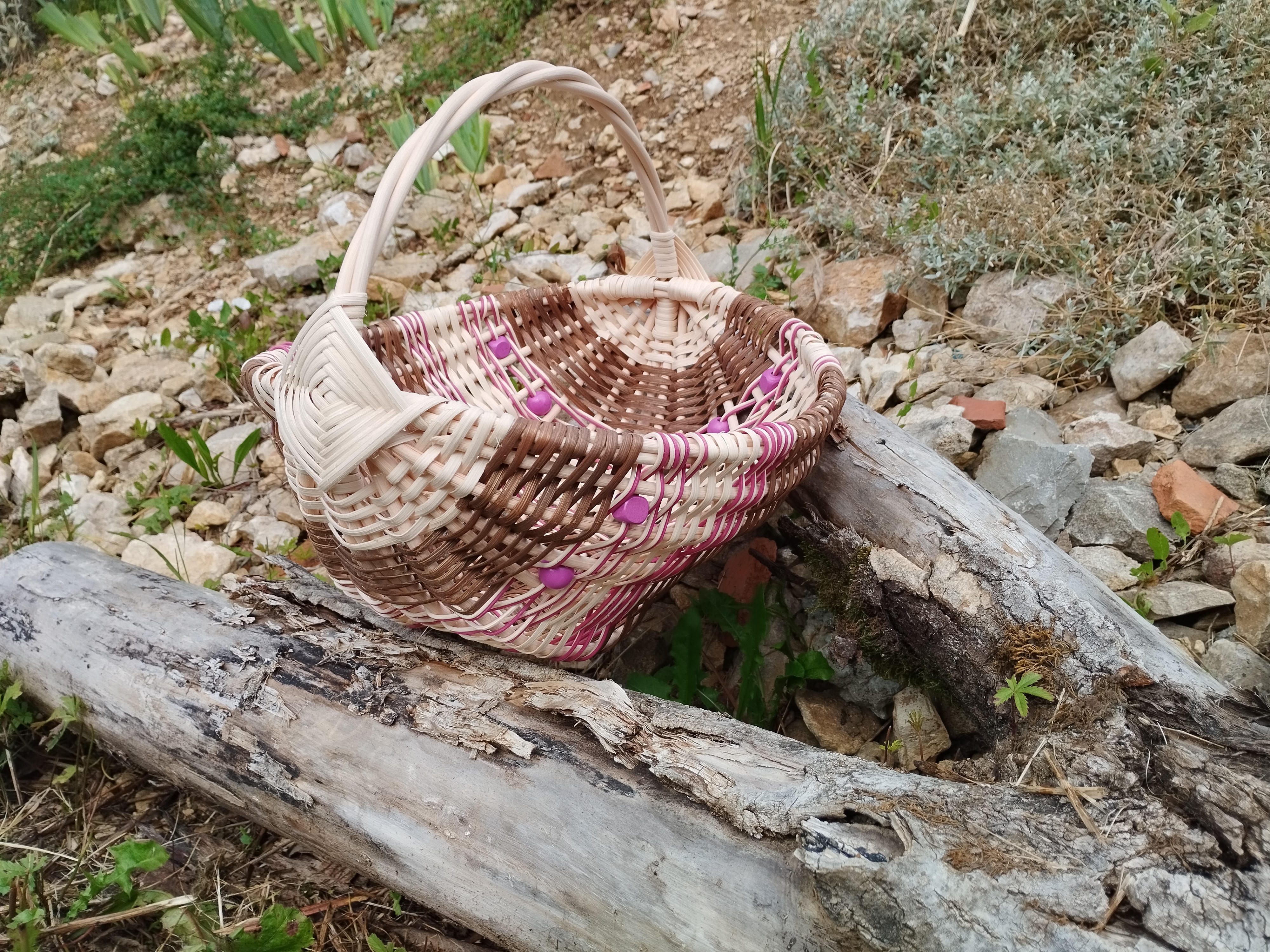 Sur le modèle du panier sur arceaux, avec une armature en moelle de rotin et un tressage en éclisse, Dominique réalise ces petites corbeilles pour mettre sur les tables de chevet de ses invités. Elle leur propose de repartir avec, alors le stock est sans cesse à renouveler !