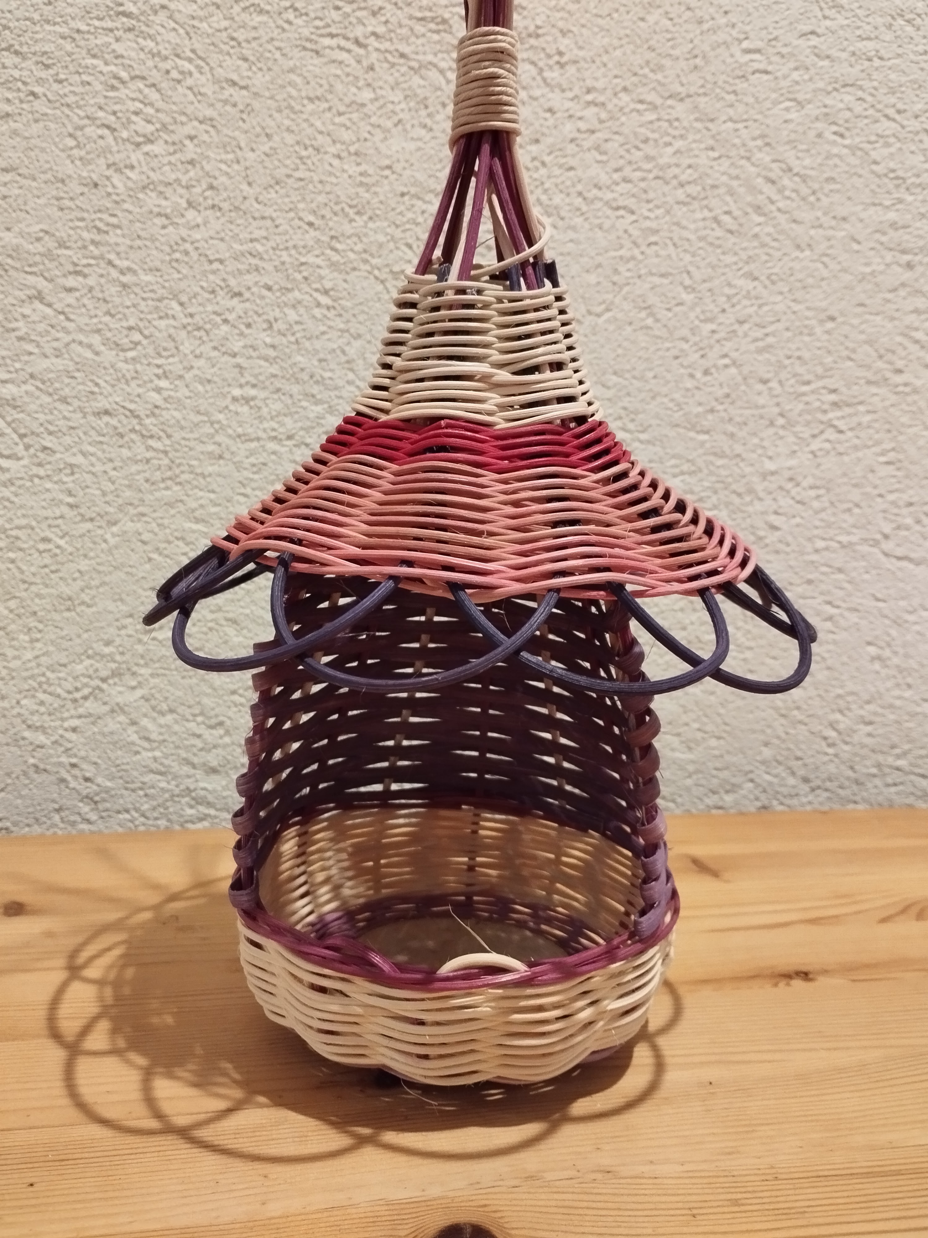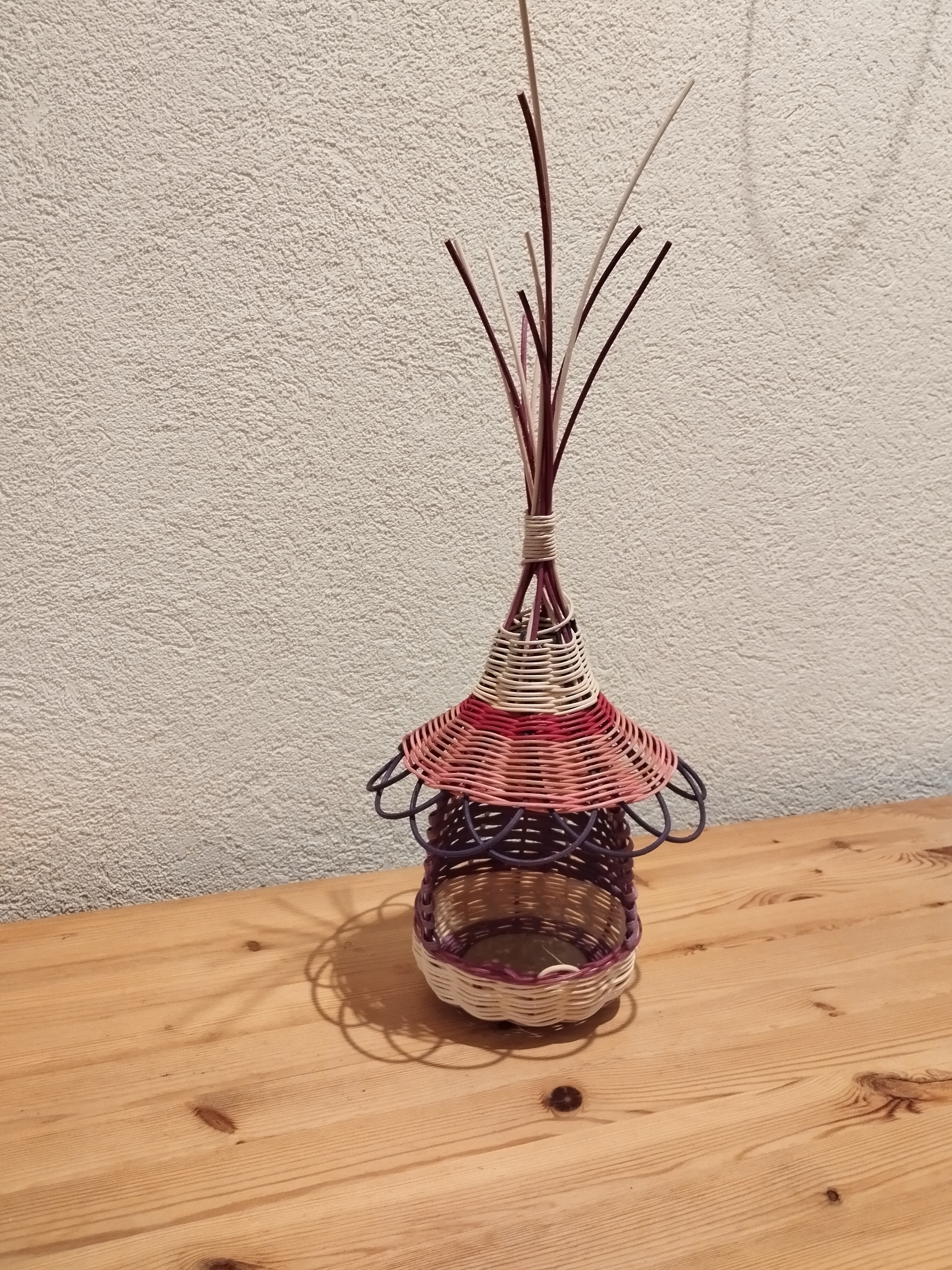 Belle réussite pour cette première mangeoire tressée par Marie-Odile. Elle a démarré sur une rondelle de bois puis tressé en moelle et éclisse de rotin.