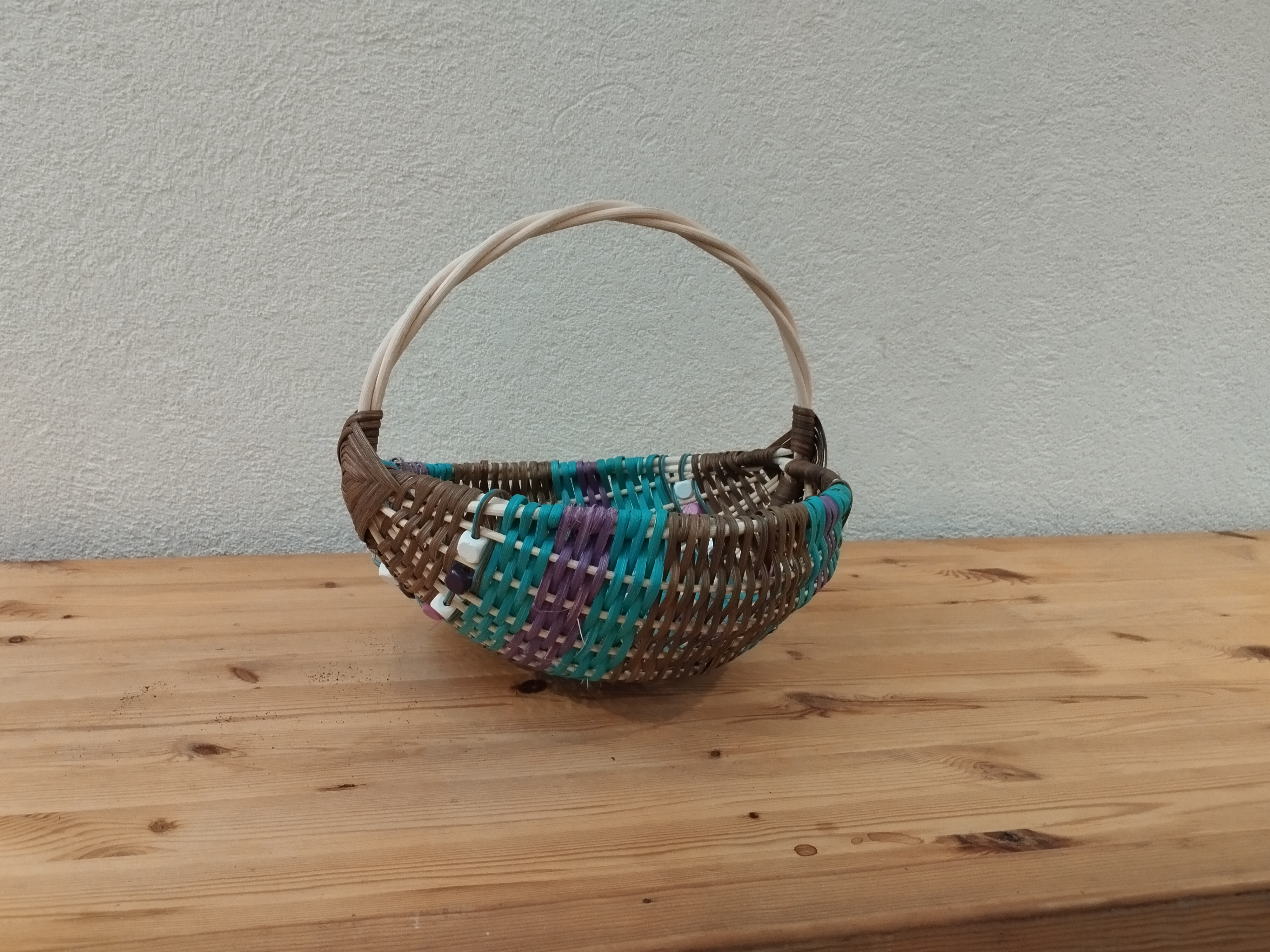 Francis a réalisé cette corbeille toute colorée en moelle de rotin sur un fond ovale. Il a tressé la.cloture en super, torche et point diamant.