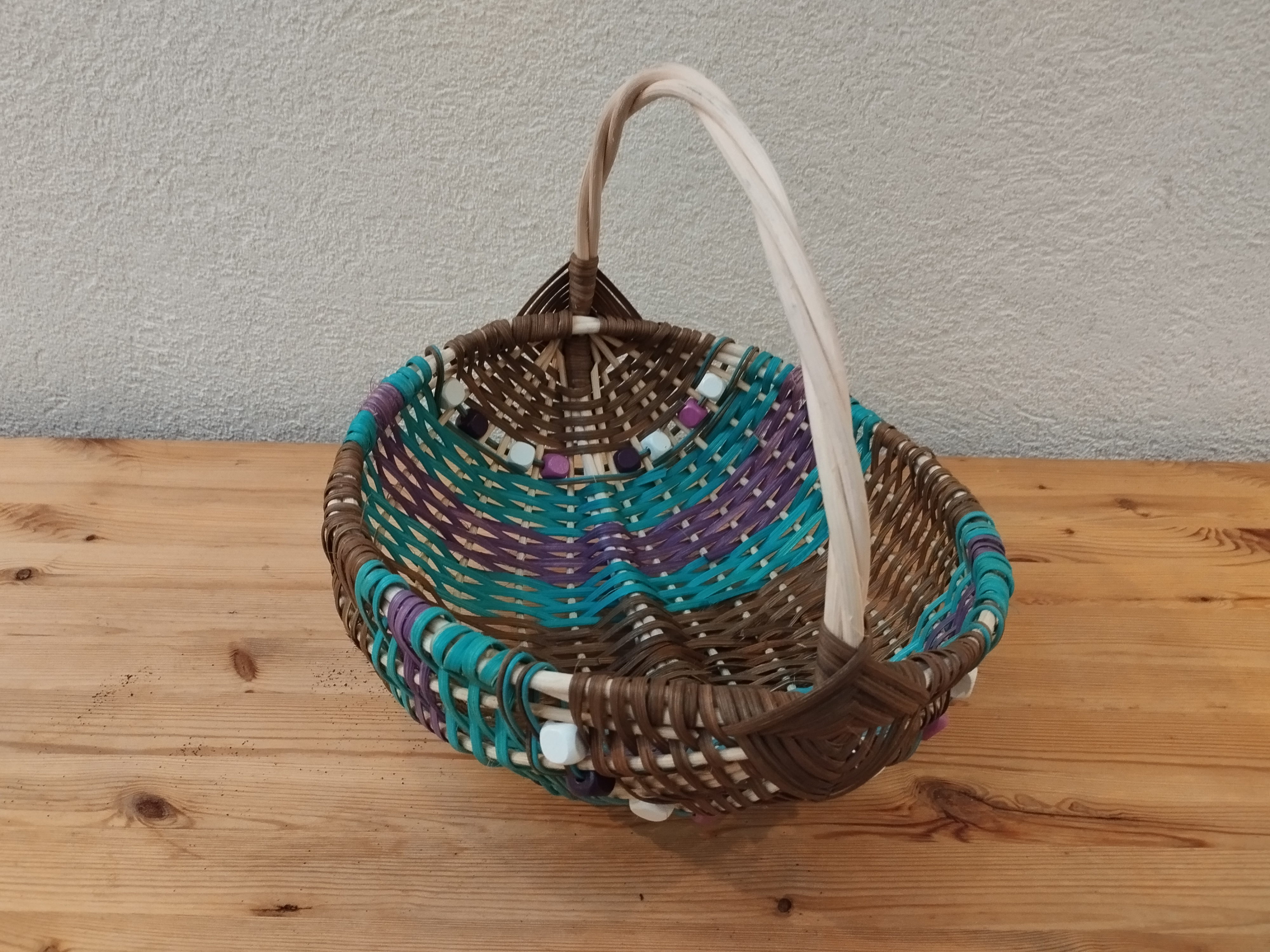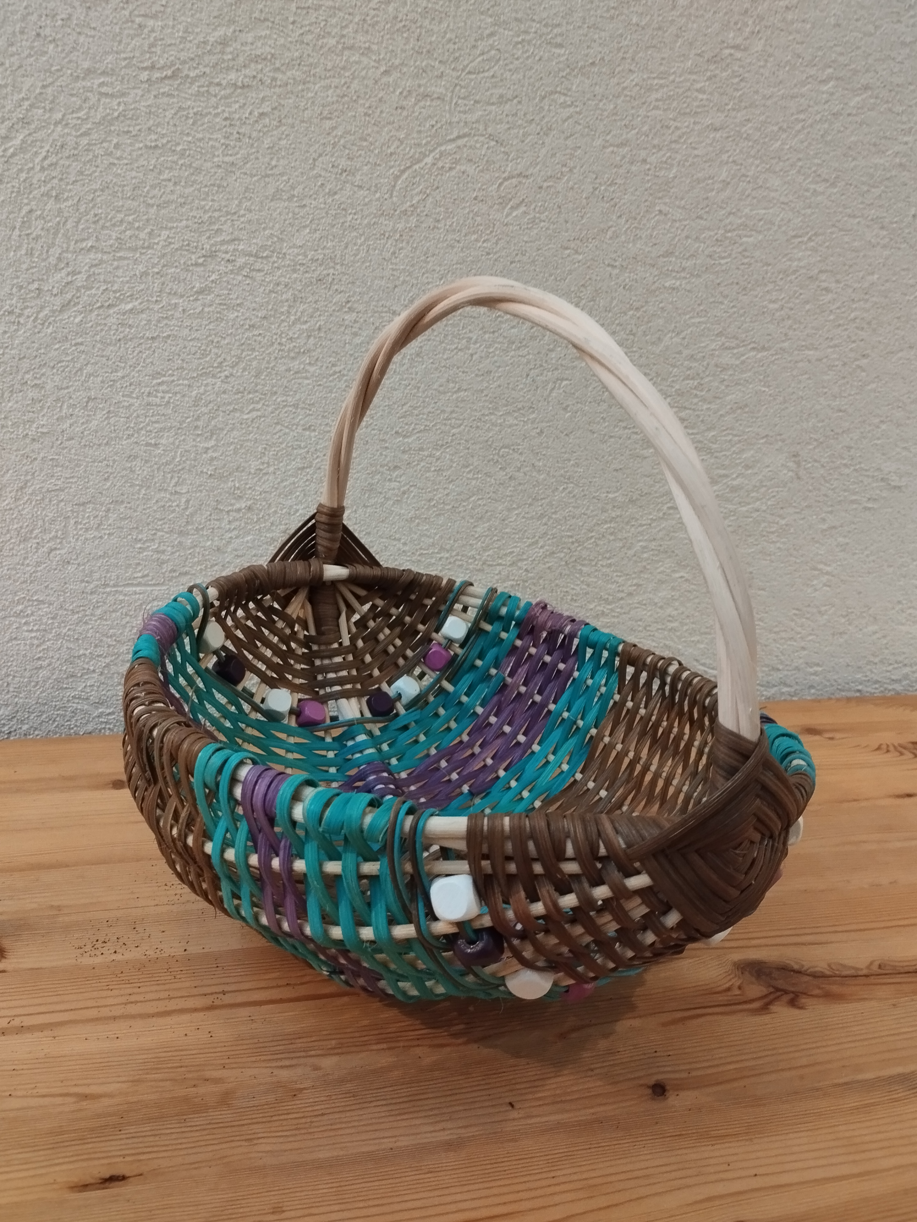 Un nouveau panier sur arceaux pour Nelly, avec toujours un savant assortiments de moelle et éclisse de rotin et perles en bois.