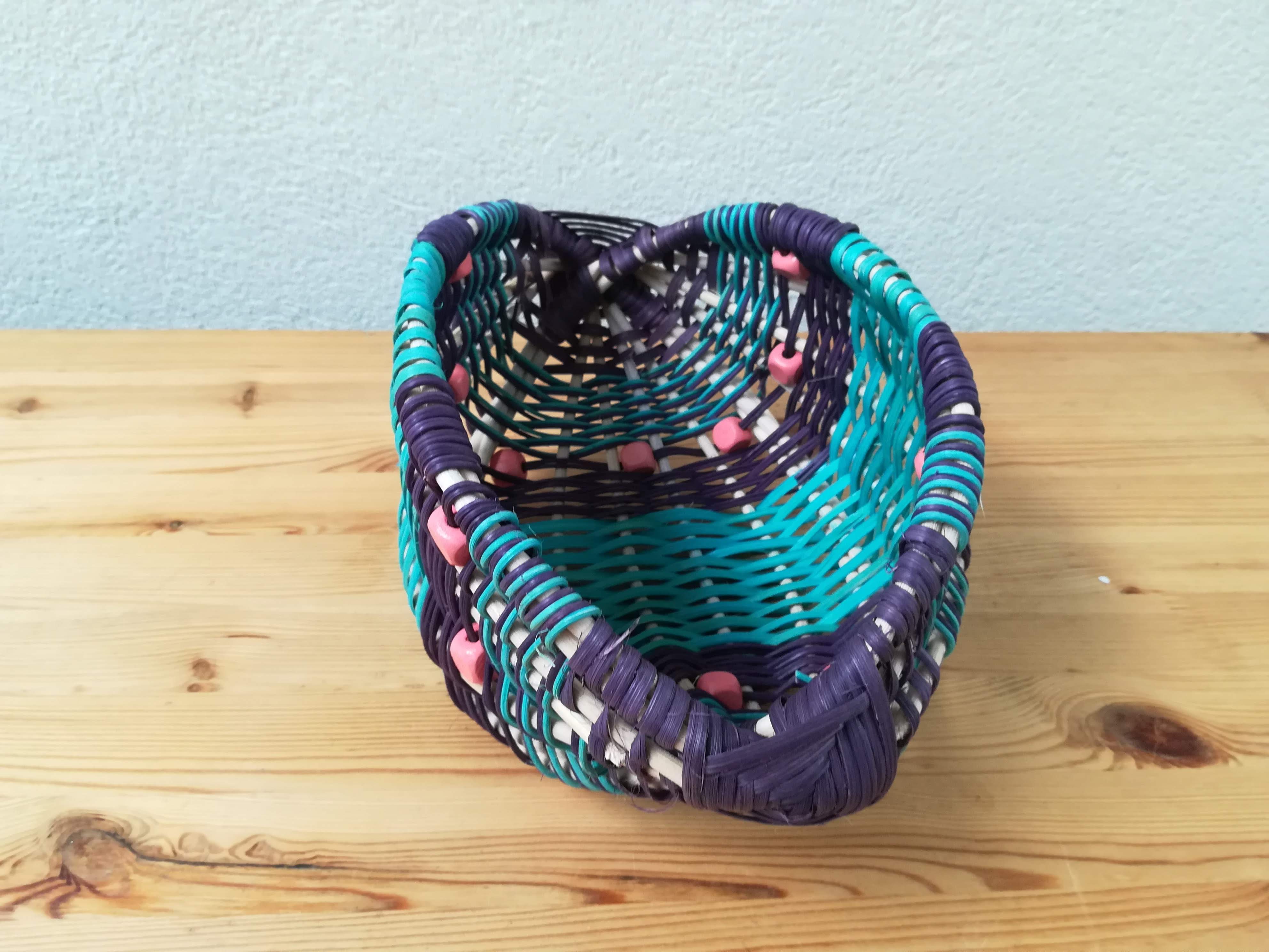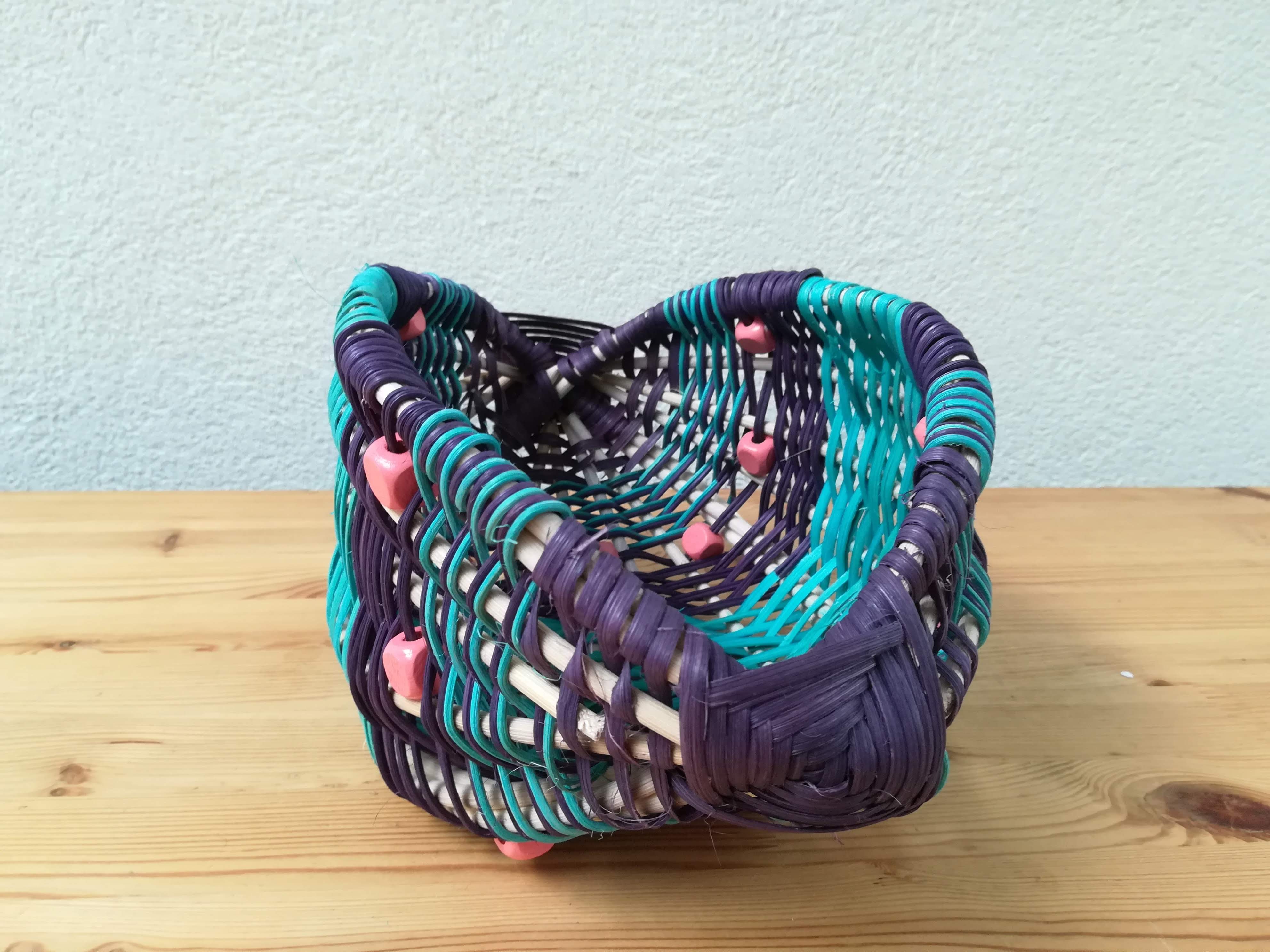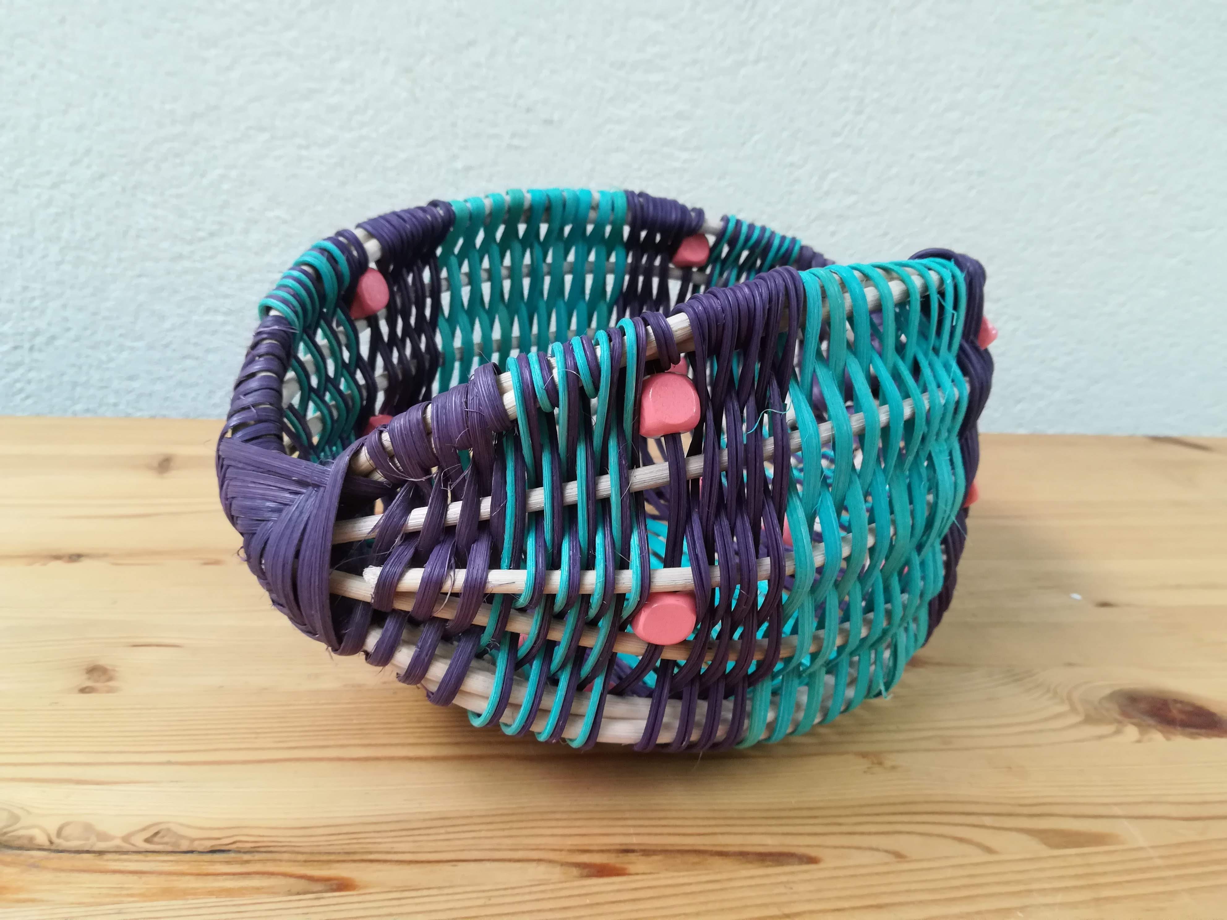 Après des mois passés à réaliser son Totoro, Fanny est repartie sur des classiques avec ce panier sur arceaux en moelle et éclisse de rotin bien coloré. Prêt à offrir !