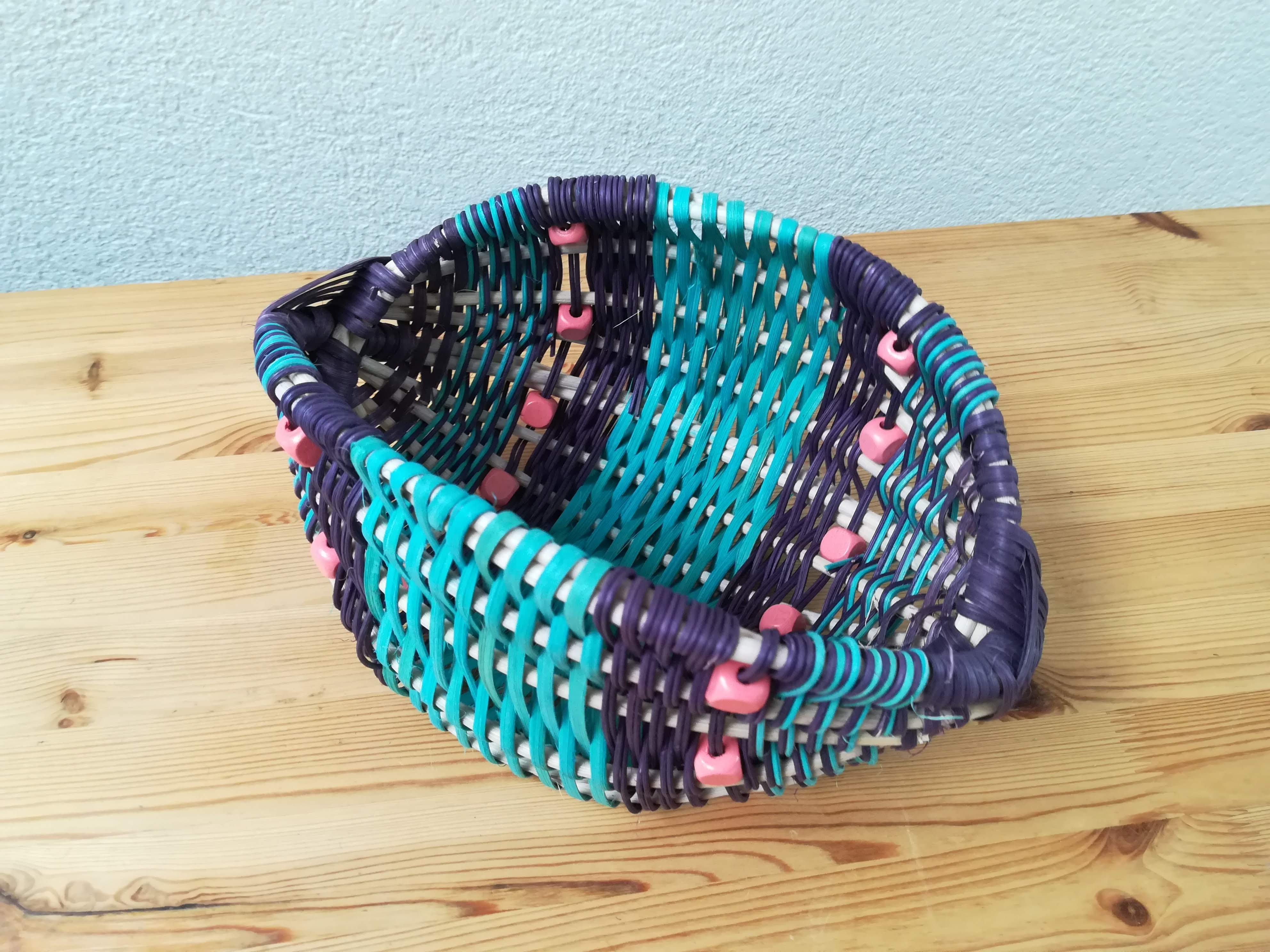 Nelly poursuit sa série de corbeilles et paniers sur arceaux ! Elle a tressé en moelle et éclisse de rotin et ajouté quelques perles en bois.
