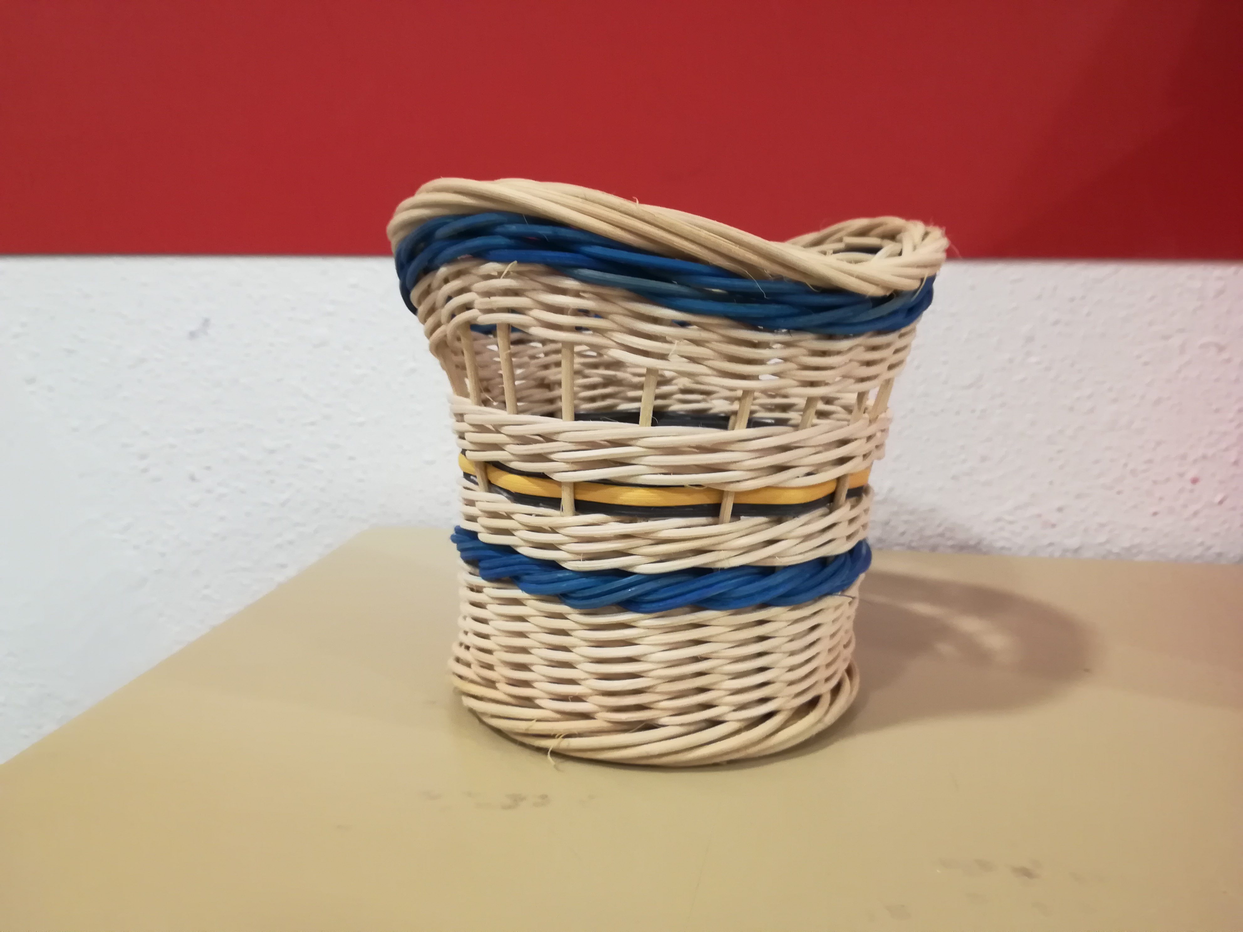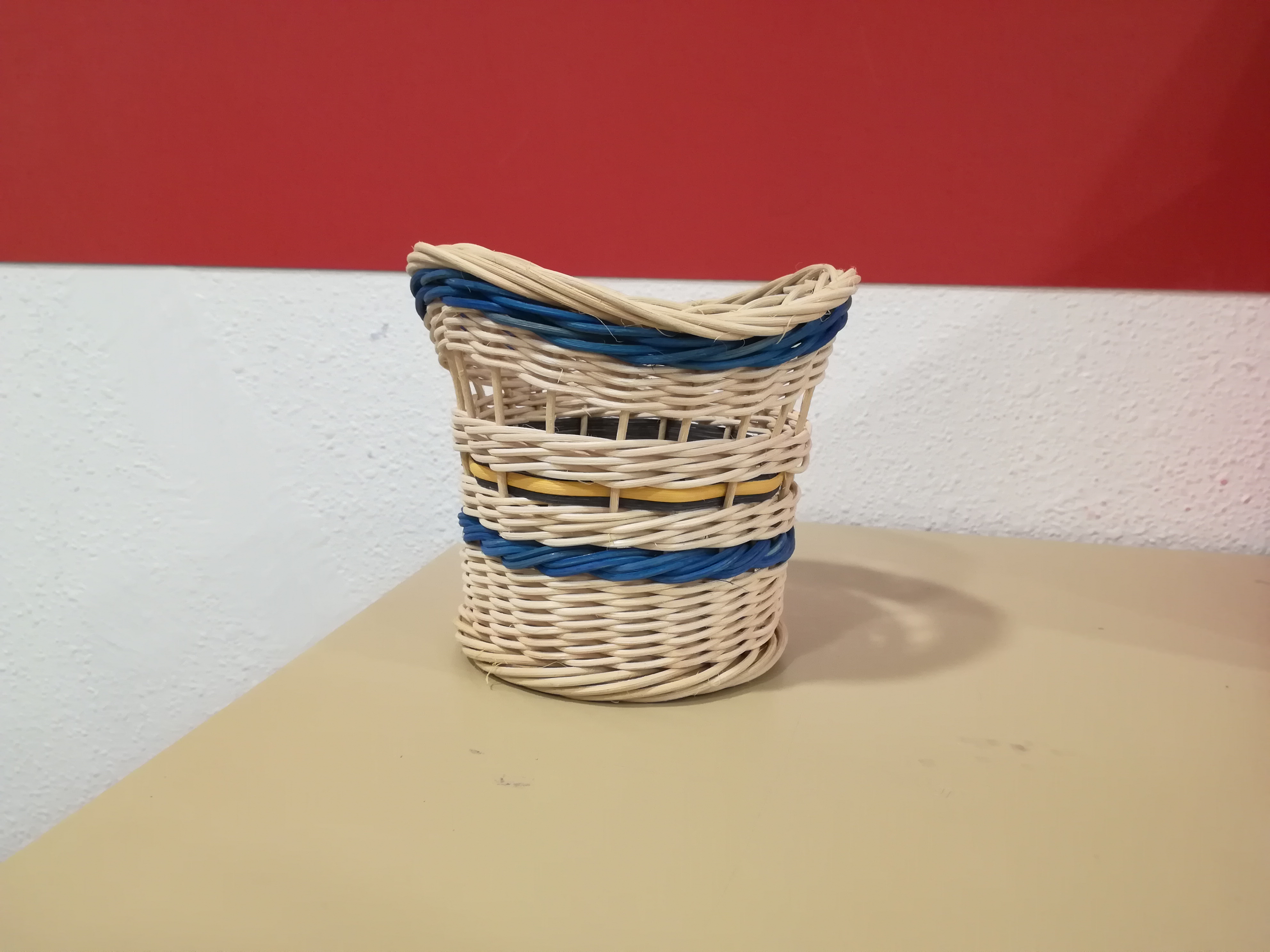 Pour sa première réalisation, Joline a fabriqué ce pot à crayons. Il en tressé en moelle et éclisse de rotin sur un fond en bois.