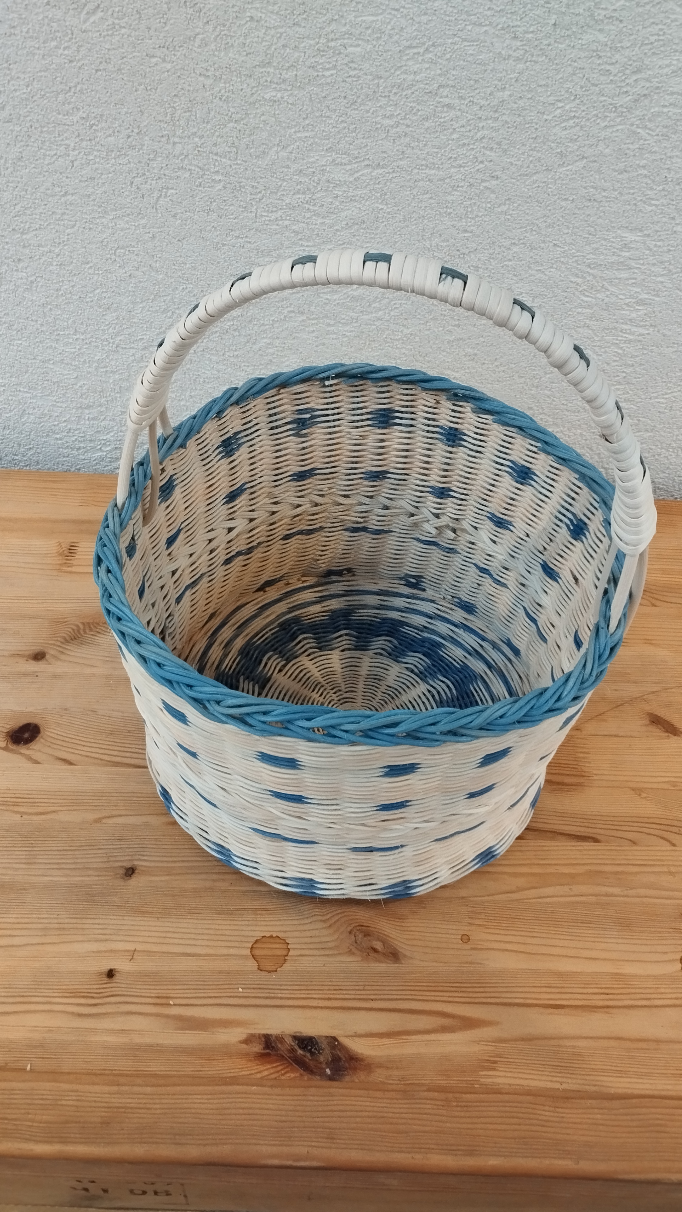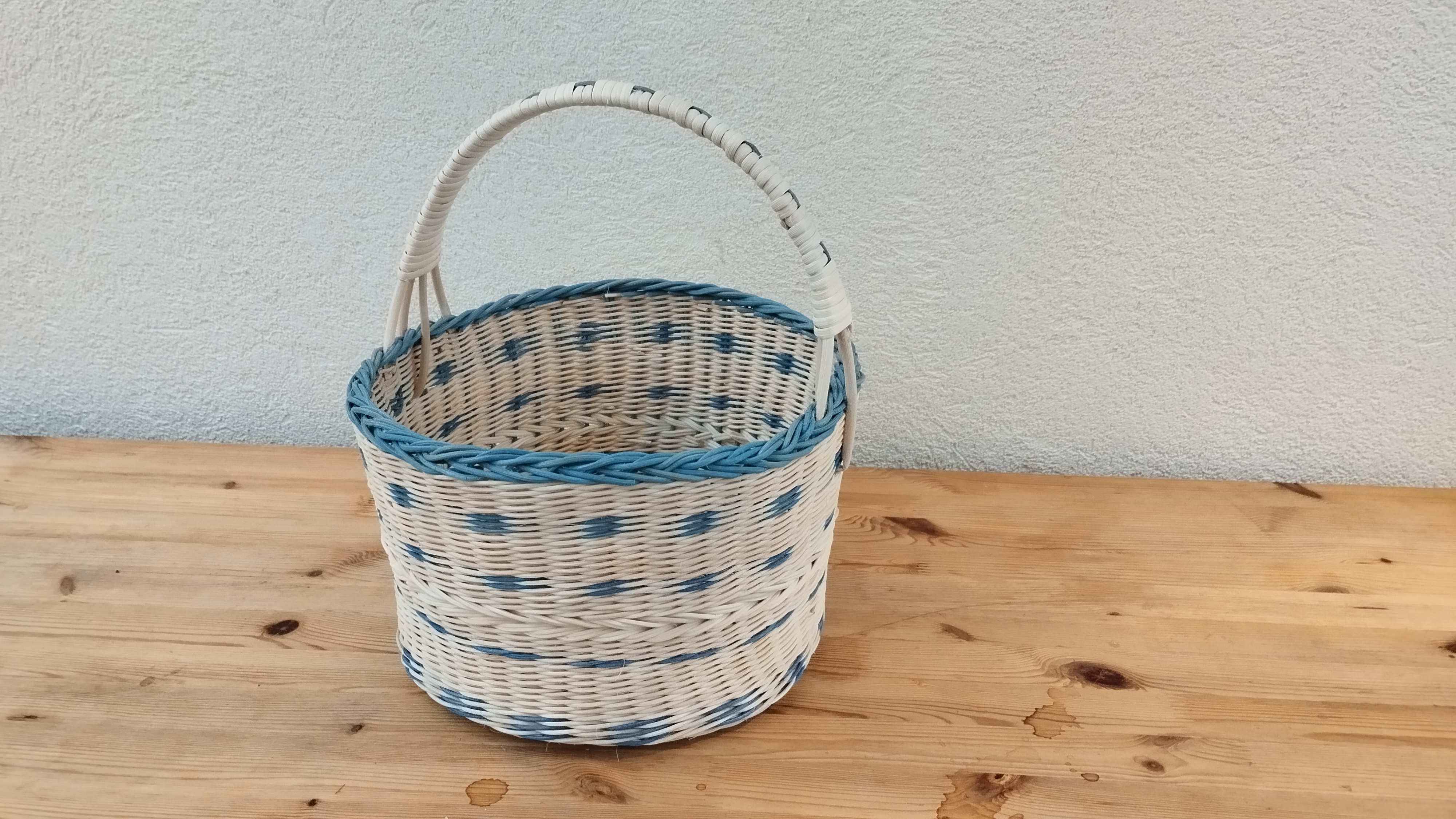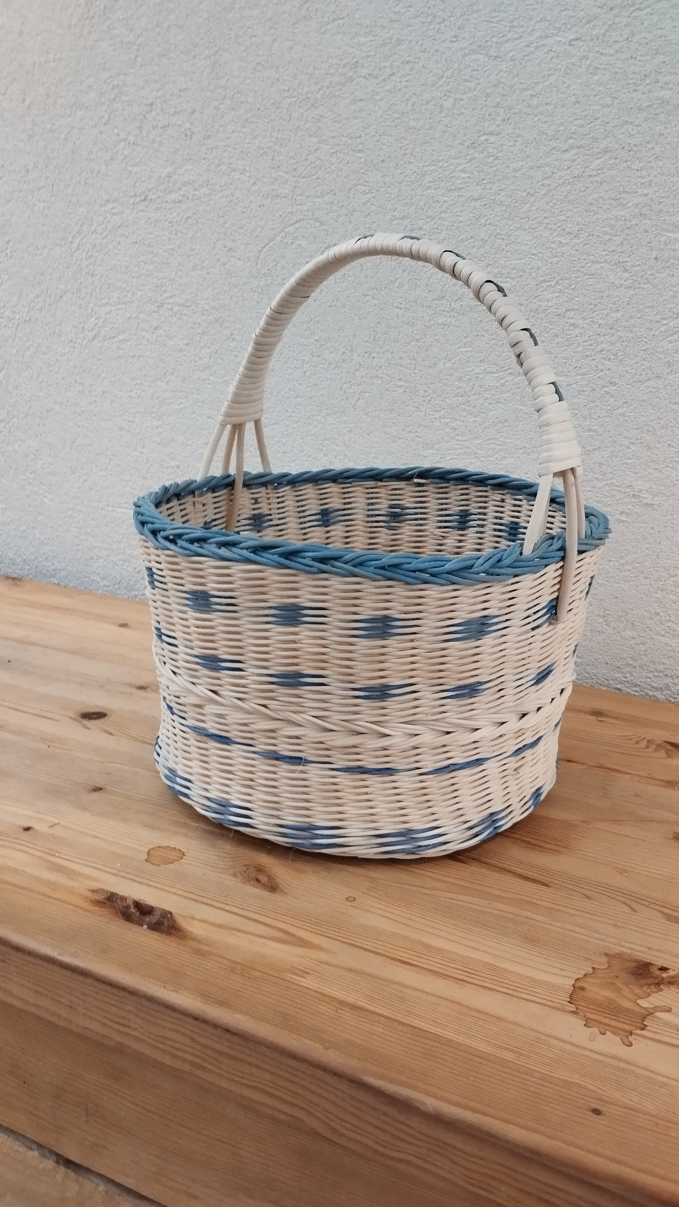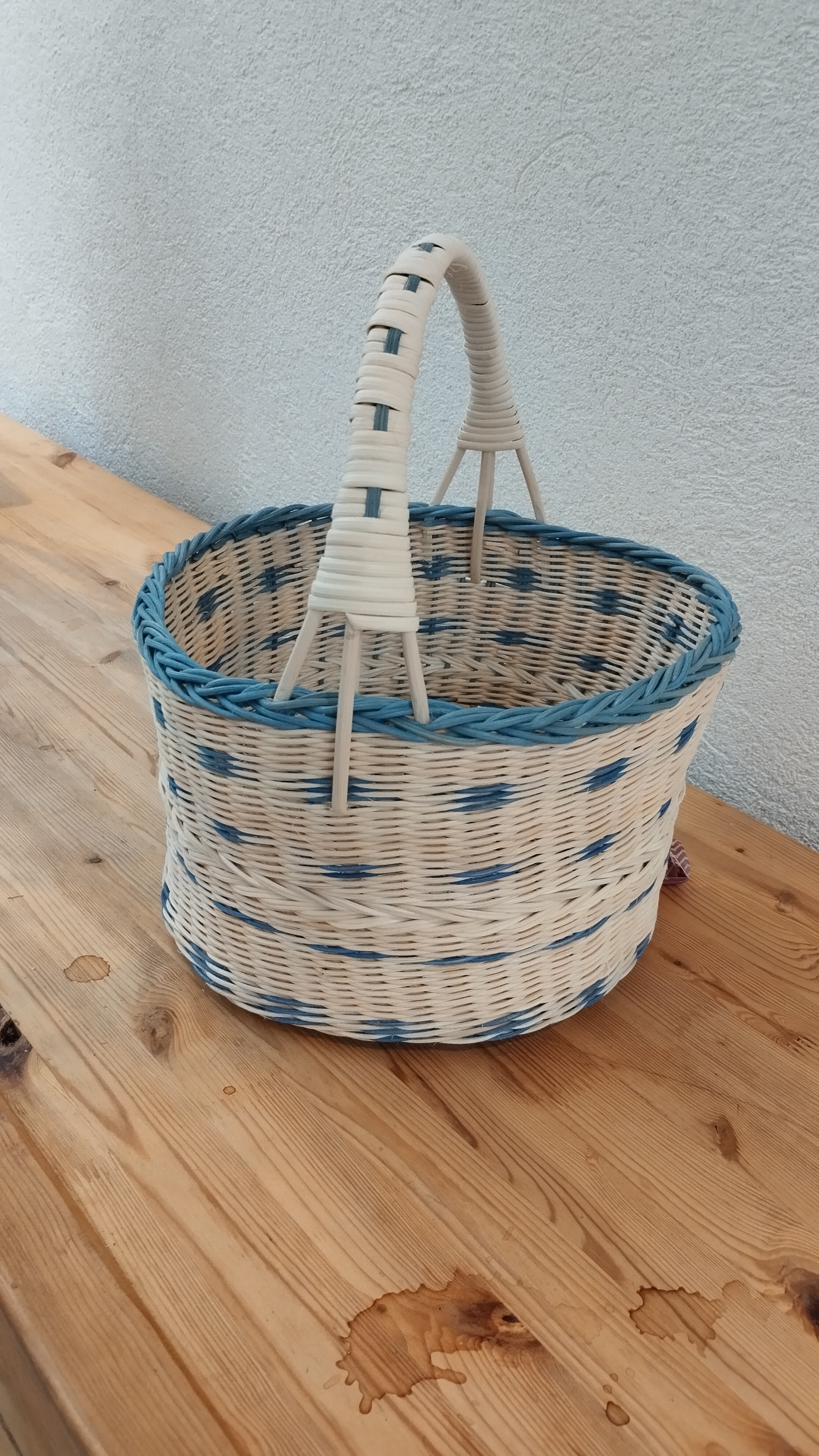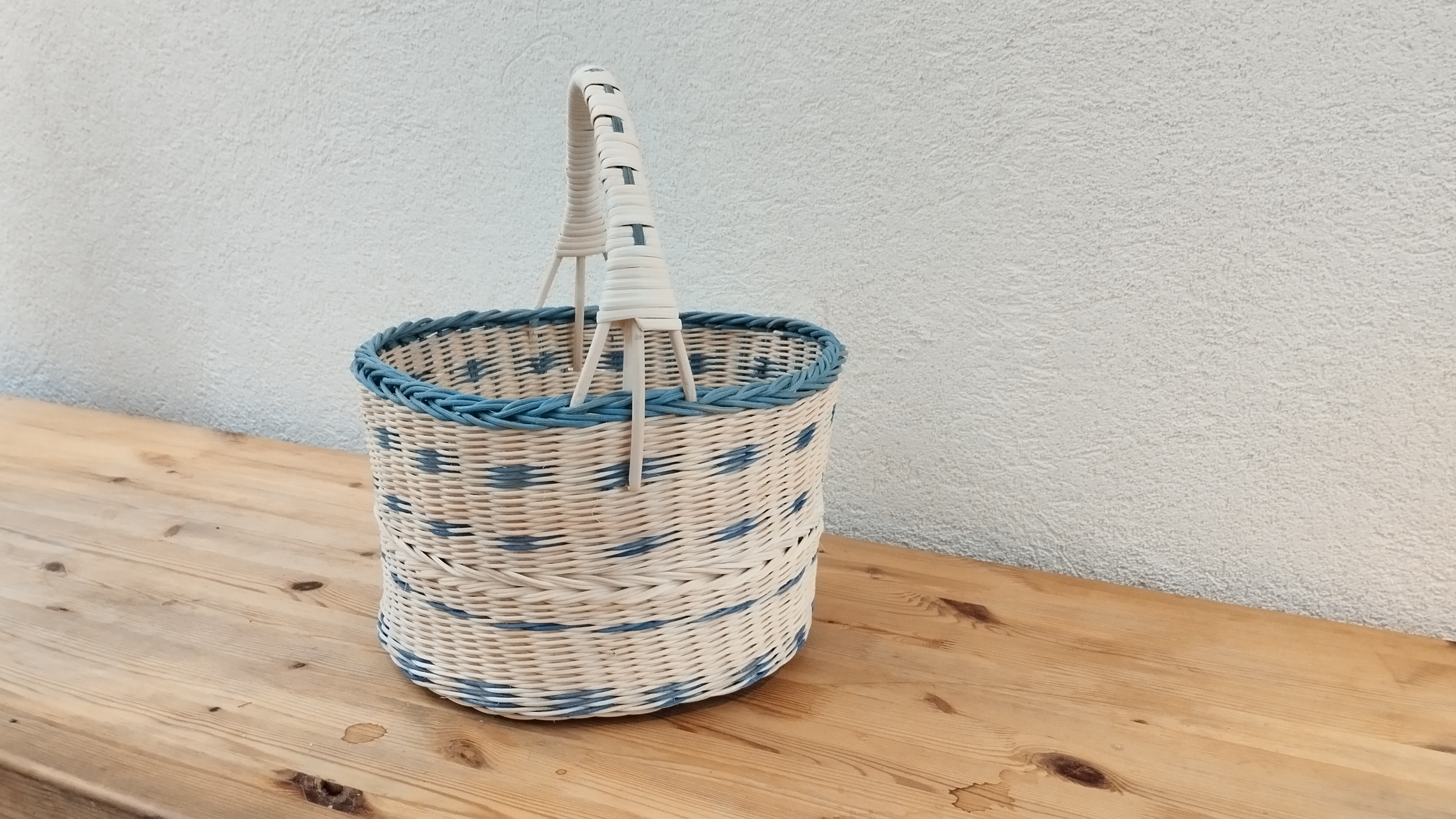 Un nouveau panier pour Pascale : elle a tressé tout en moelle de rotin naturel et bleu en variant les points de tressage, torche et fleur de lys. Elle a terminé par une bordure ordinaire et une anse recouverte d’éclisse.