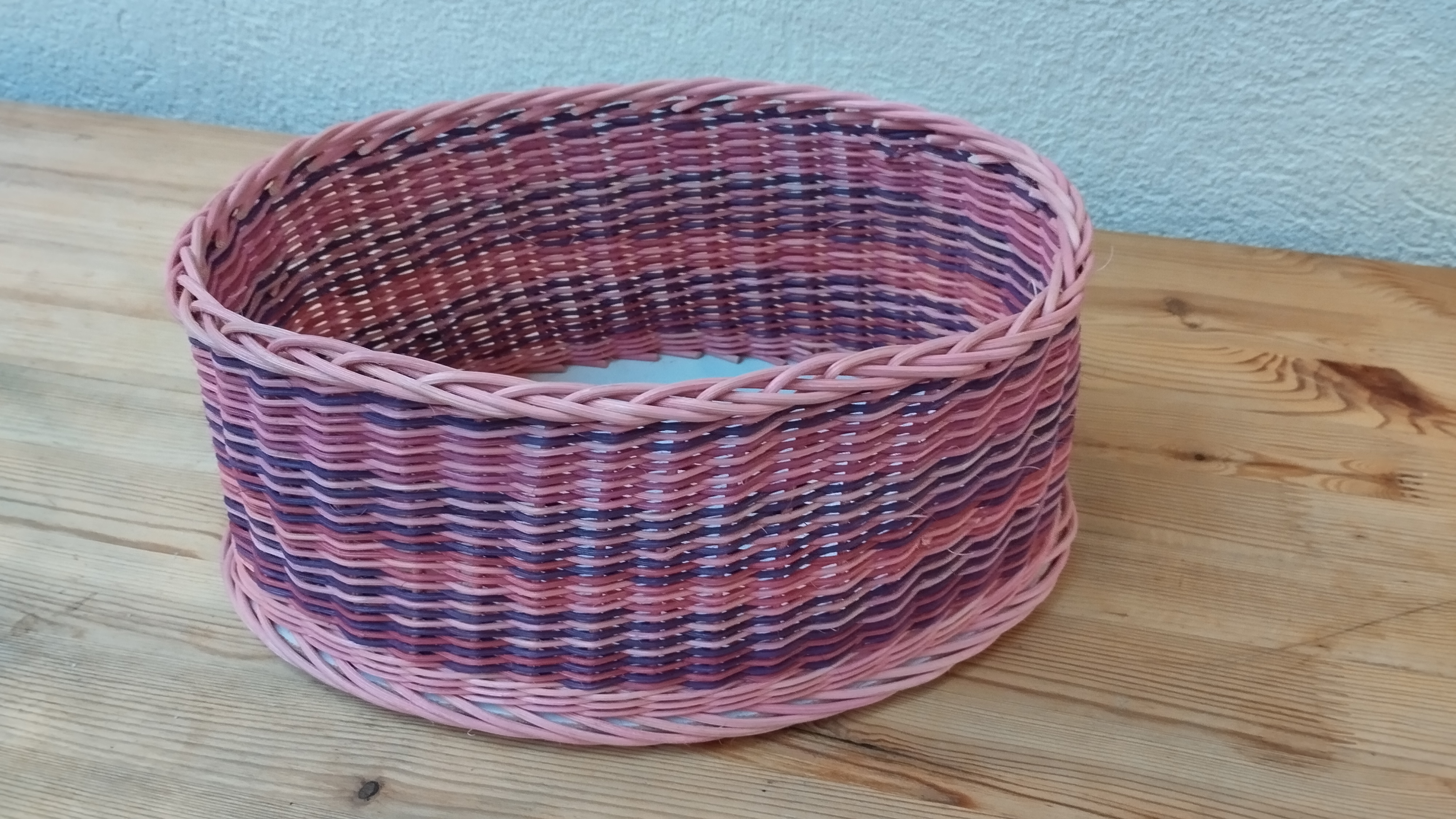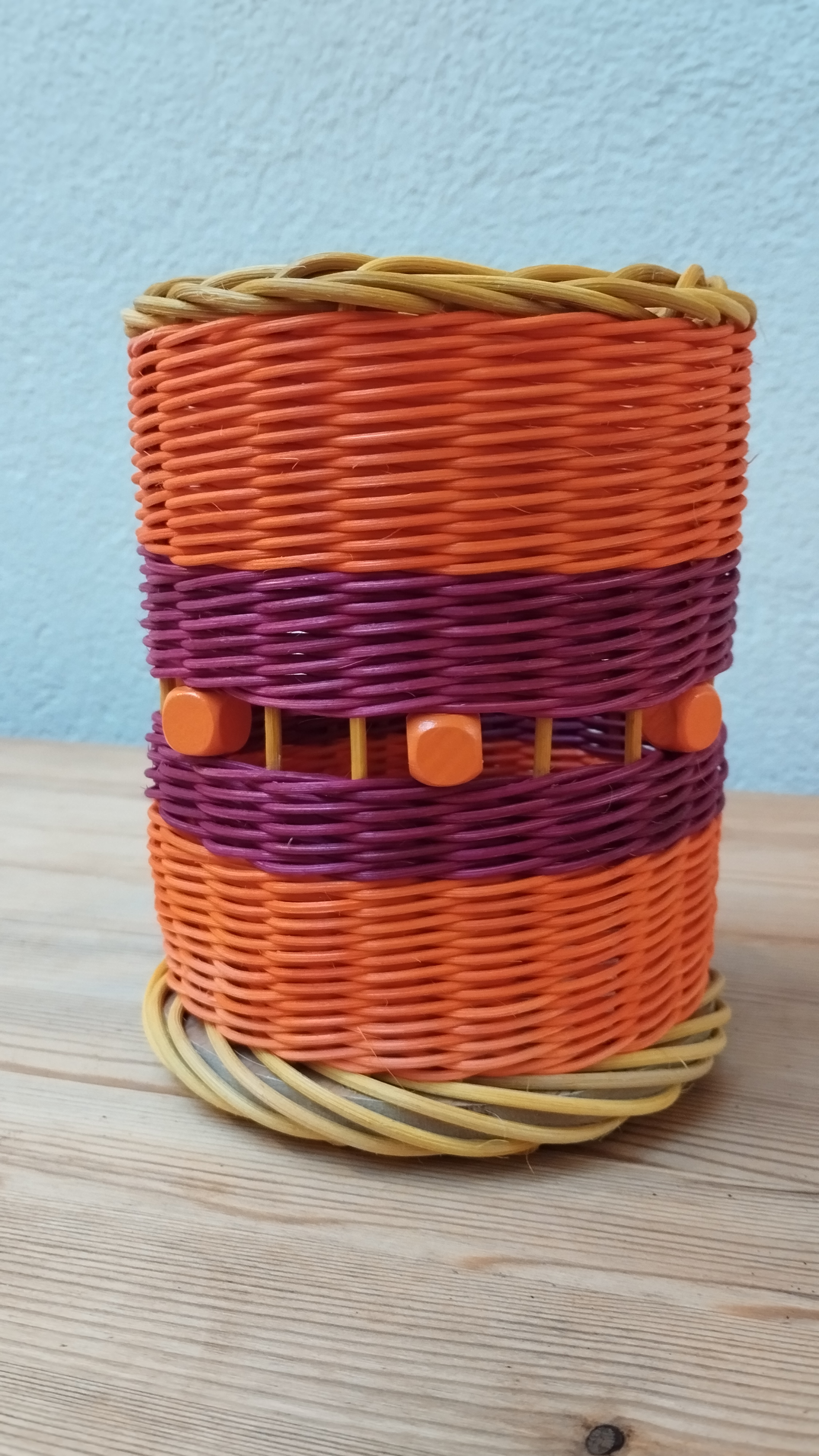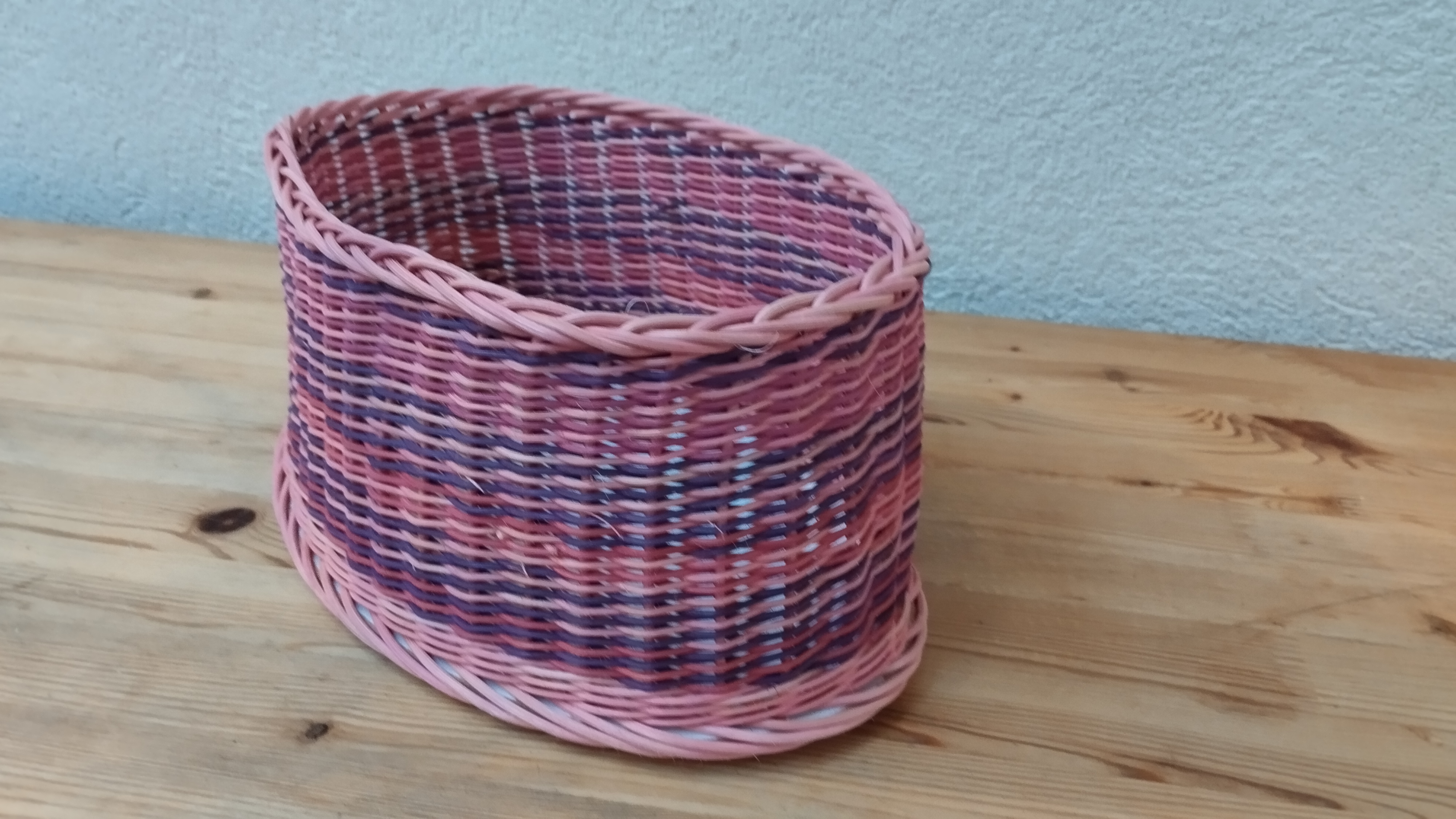 En duo avec la corbeille bleue, Béatrice a tressé celle-ci avec de la moelle de rotin dans les tons rose et violet sur un support en bois.