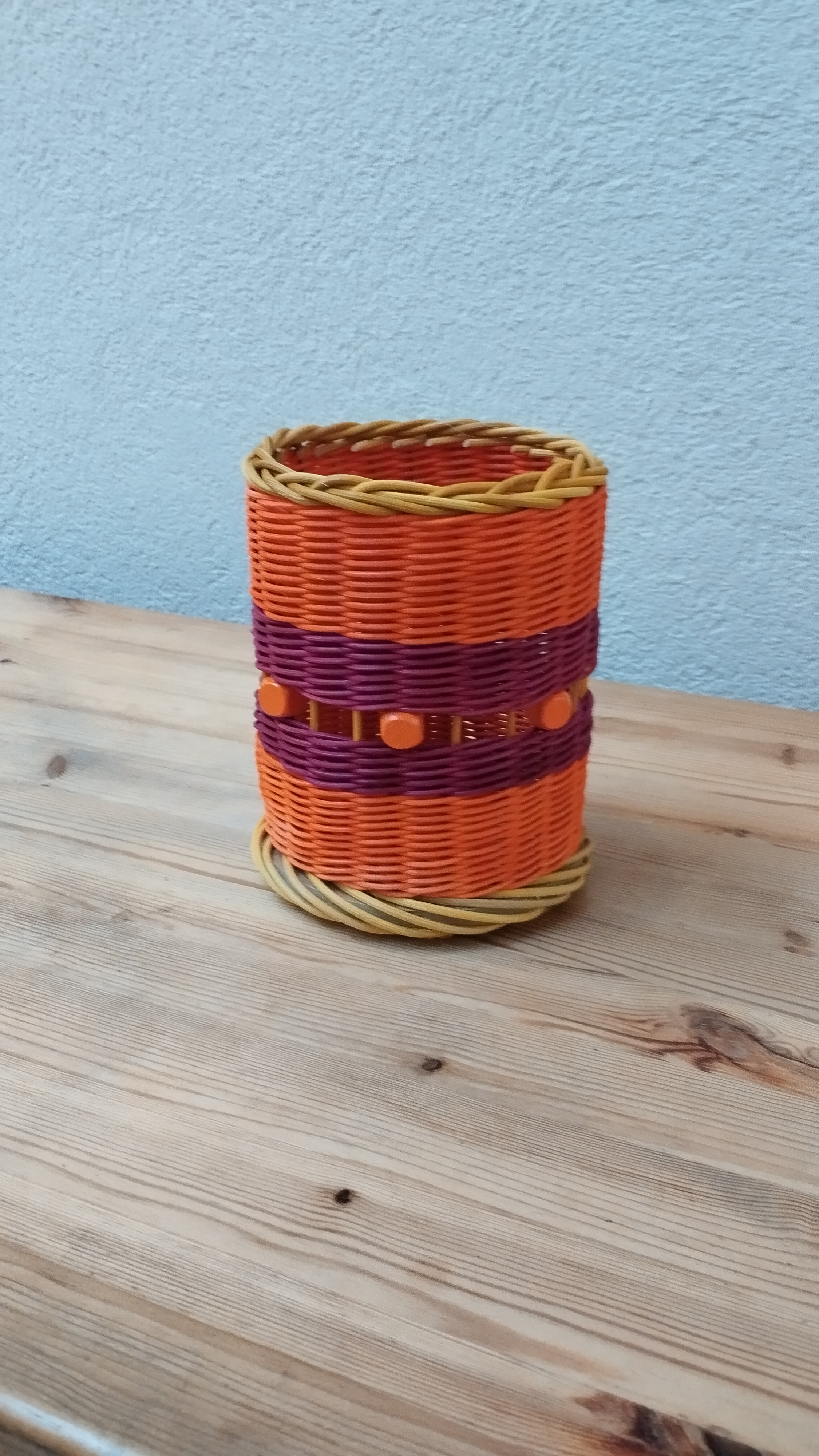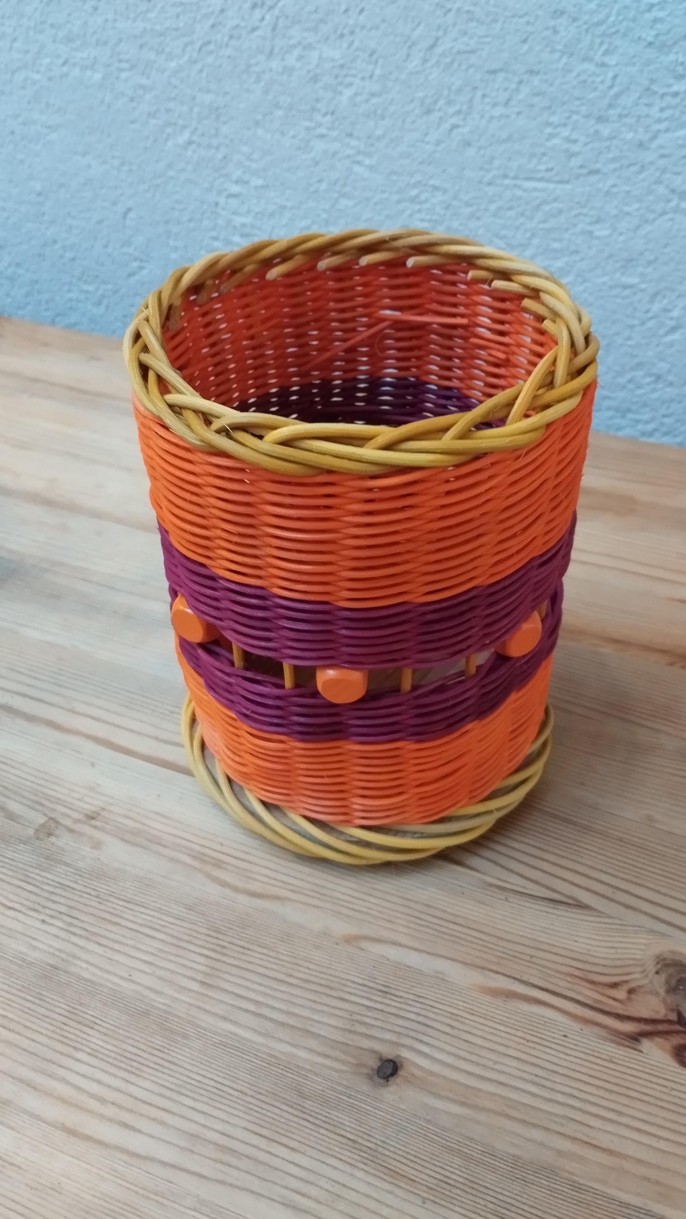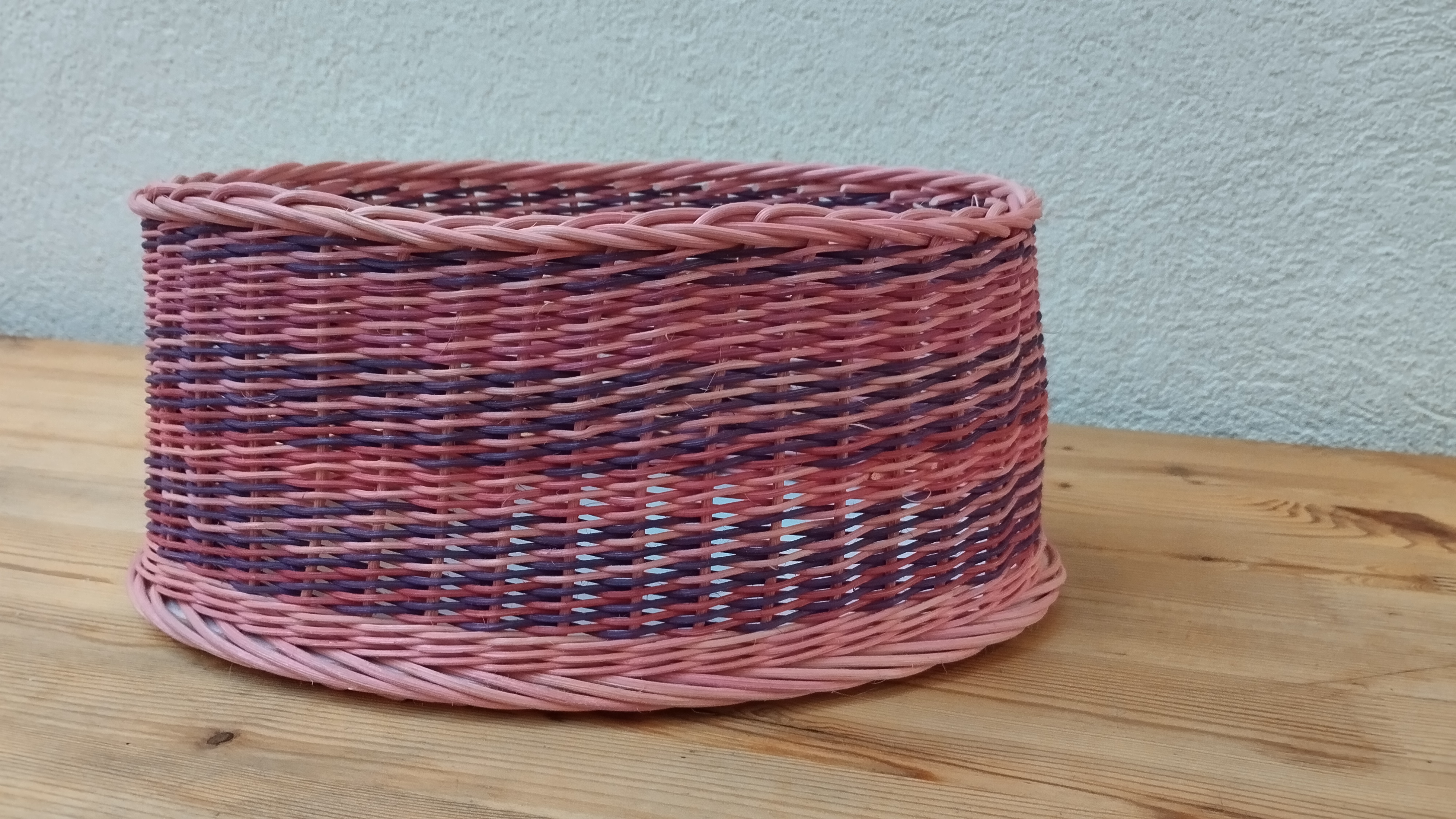En duo avec la corbeille bleue, Béatrice a tressé celle-ci avec de la moelle de rotin dans les tons rose et violet sur un support en bois.