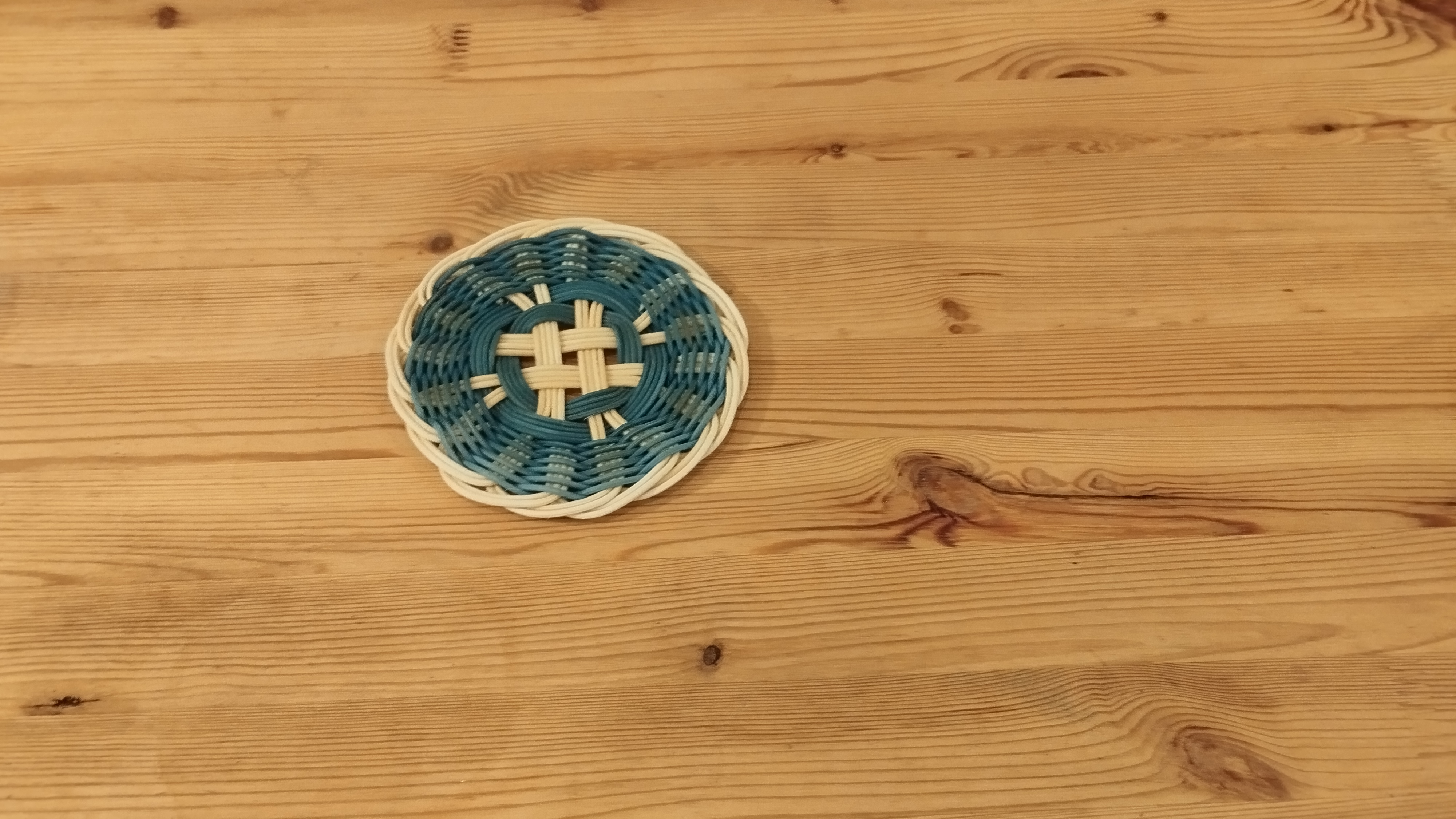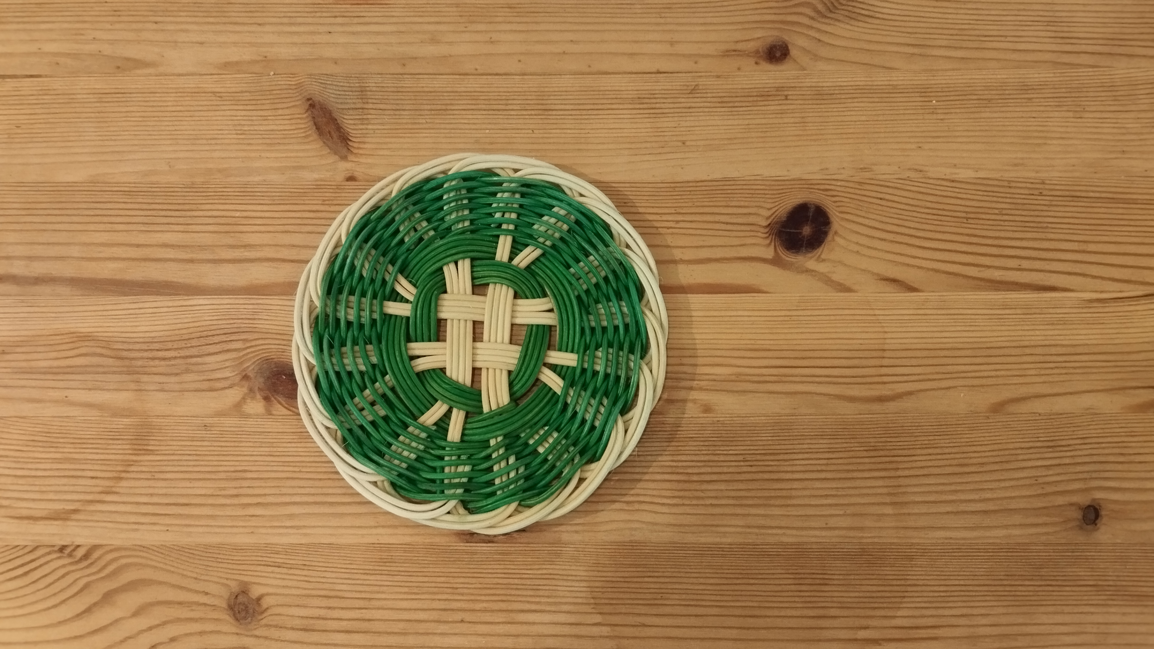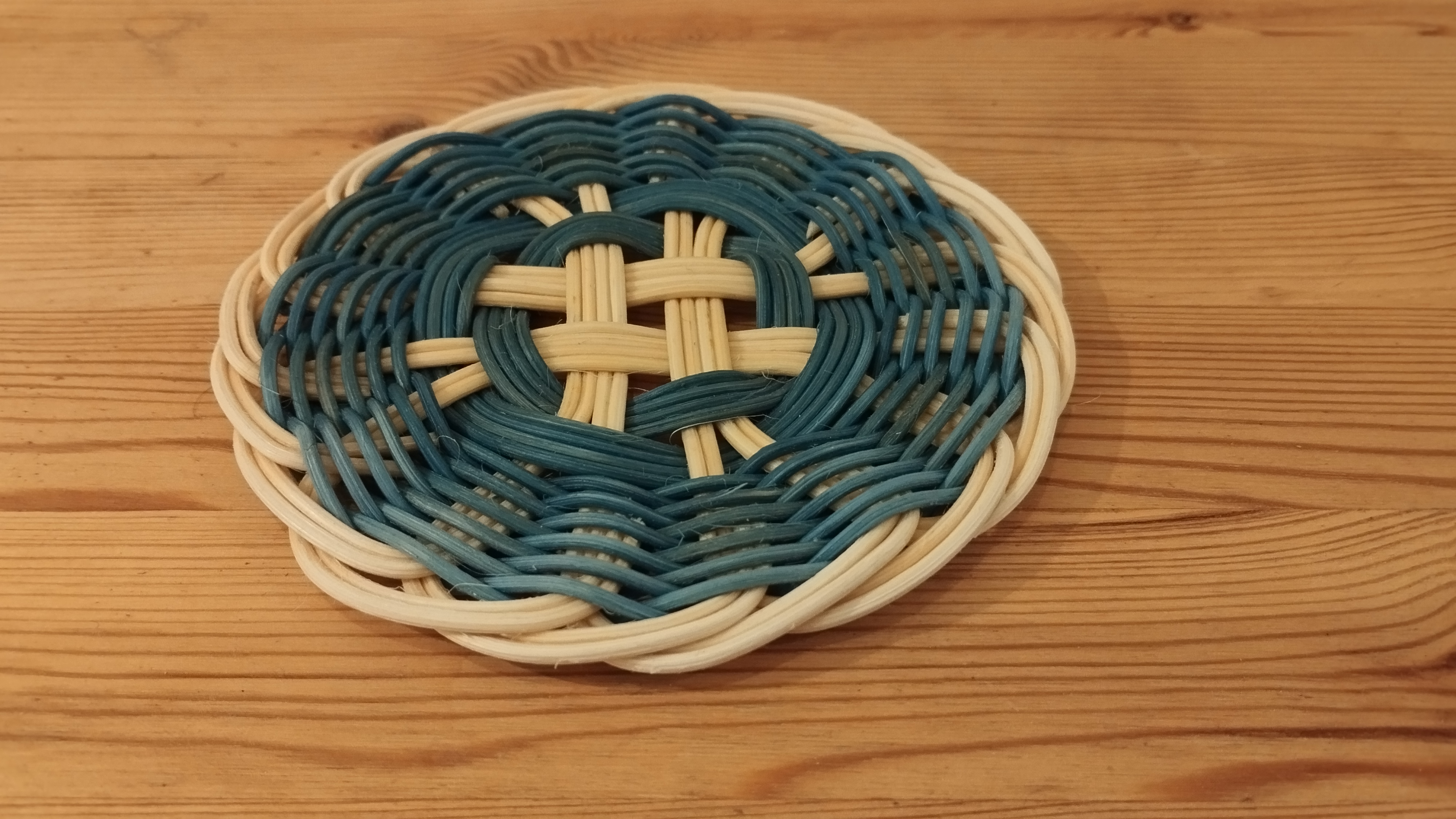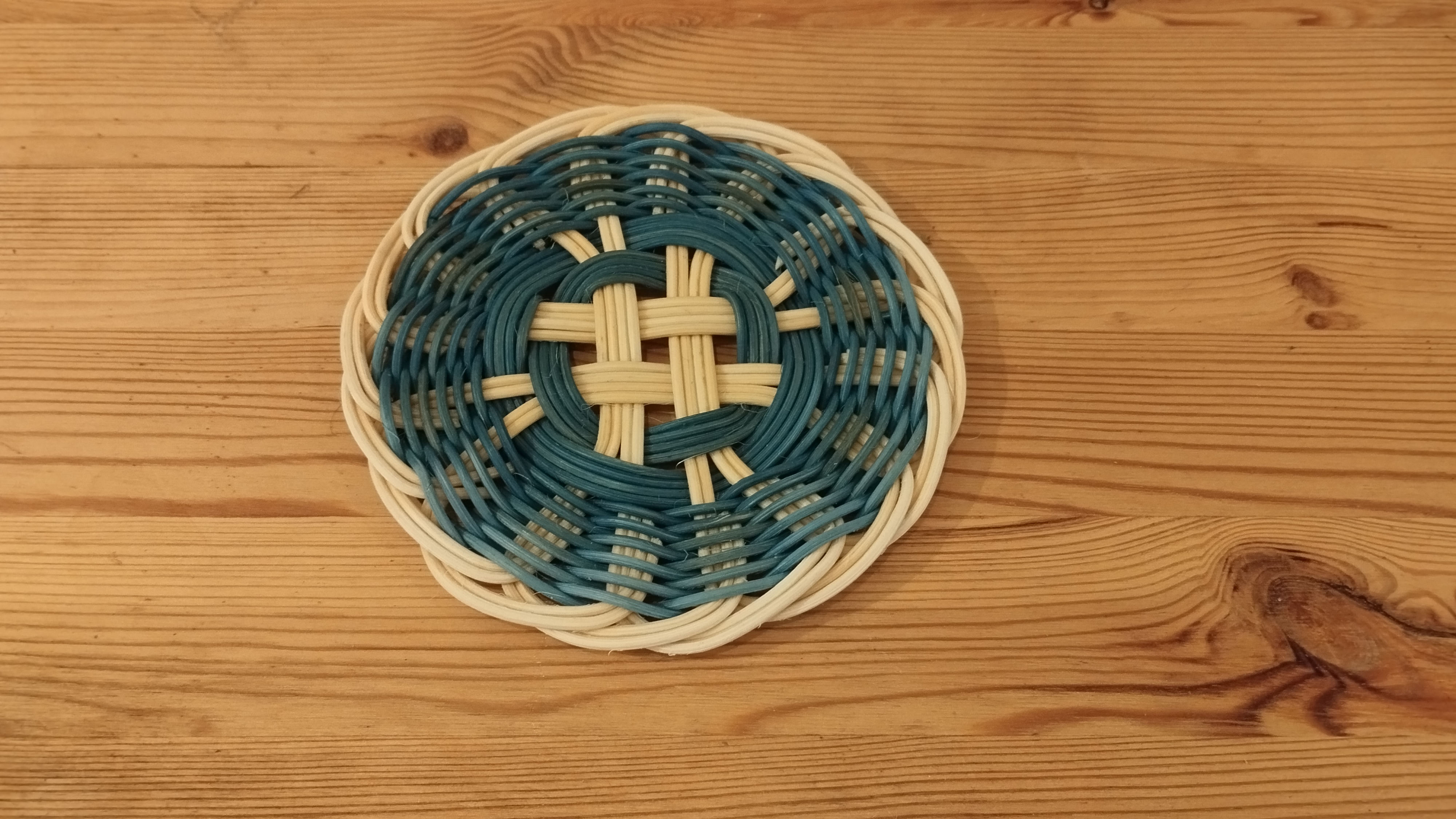 Sur un fond en bois, Cathy a réalisé cette petite corbeille en tressant en super avec de la moelle de rotin.