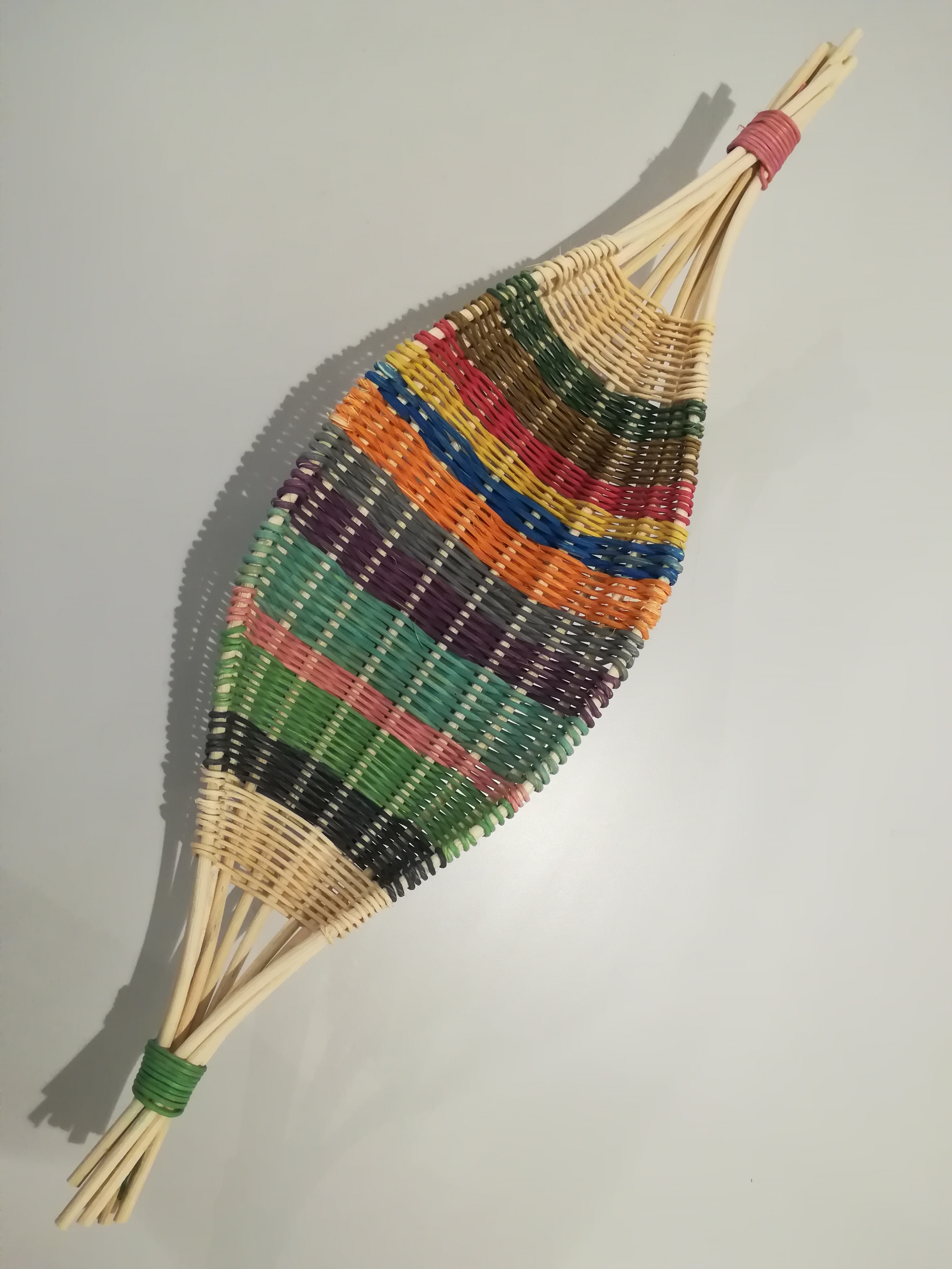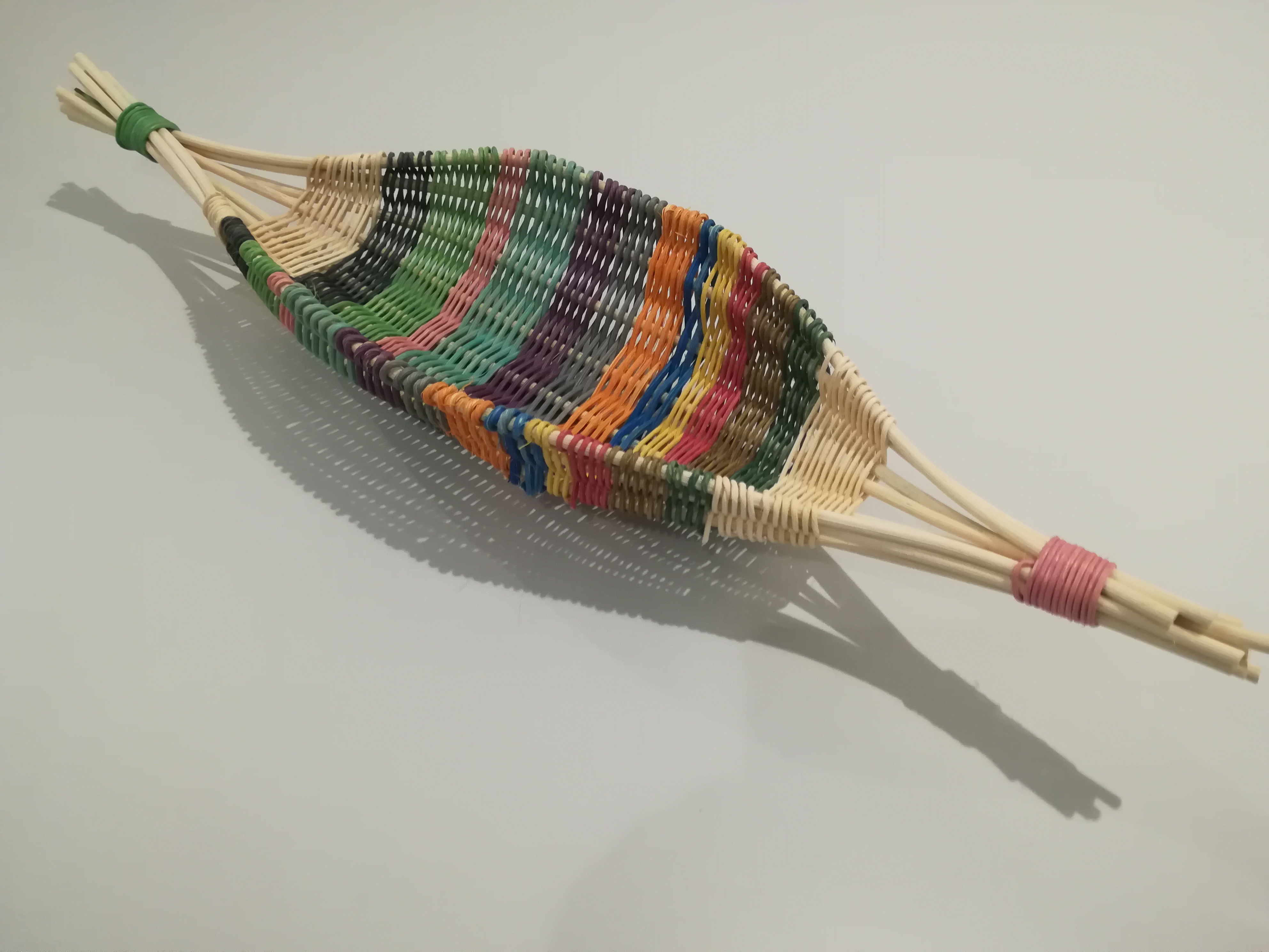 La corbeille kayak a pris des couleurs et s’est agrandie. Tout en moelle de rotin avec un tressage en brins suivis.