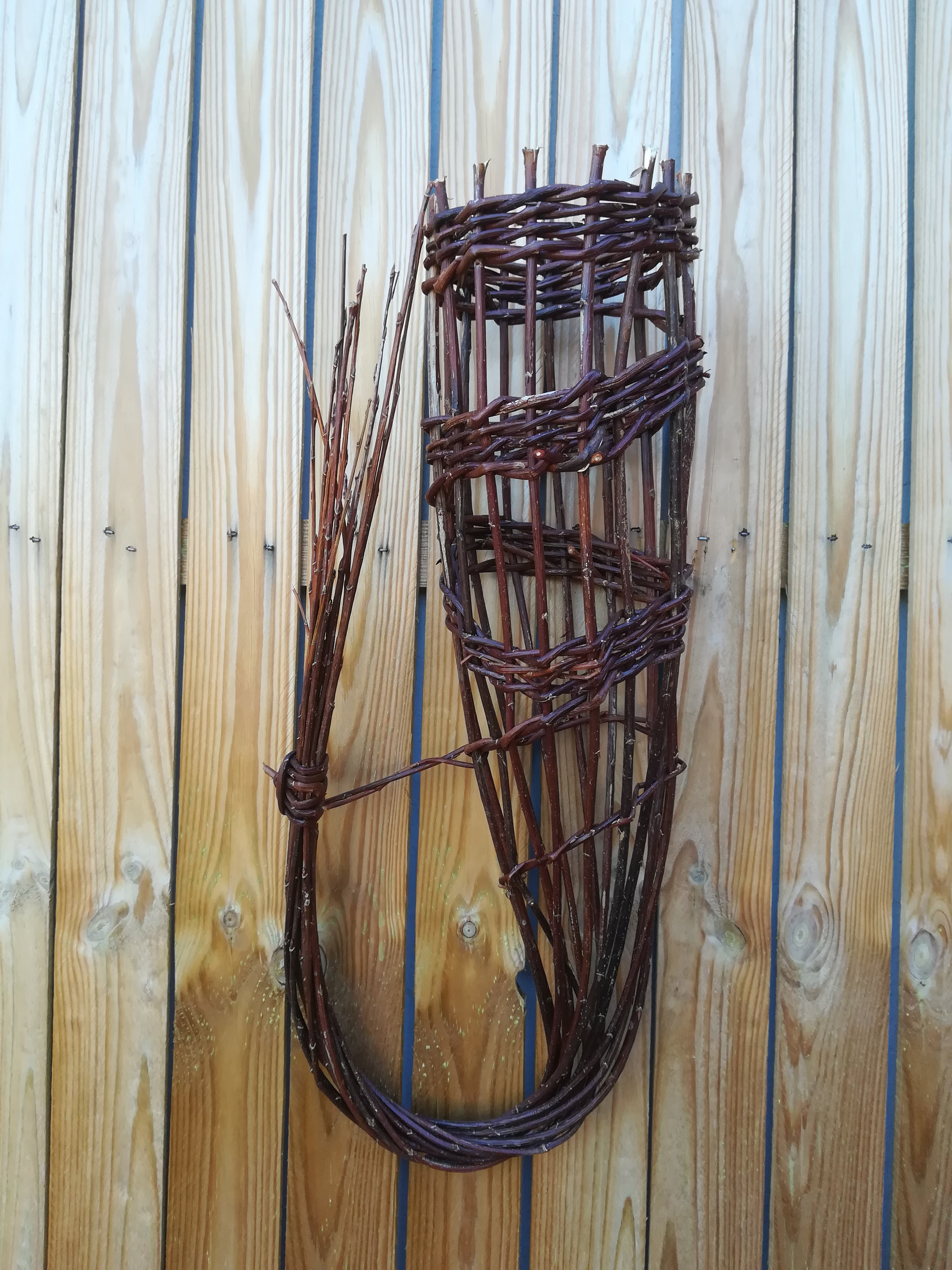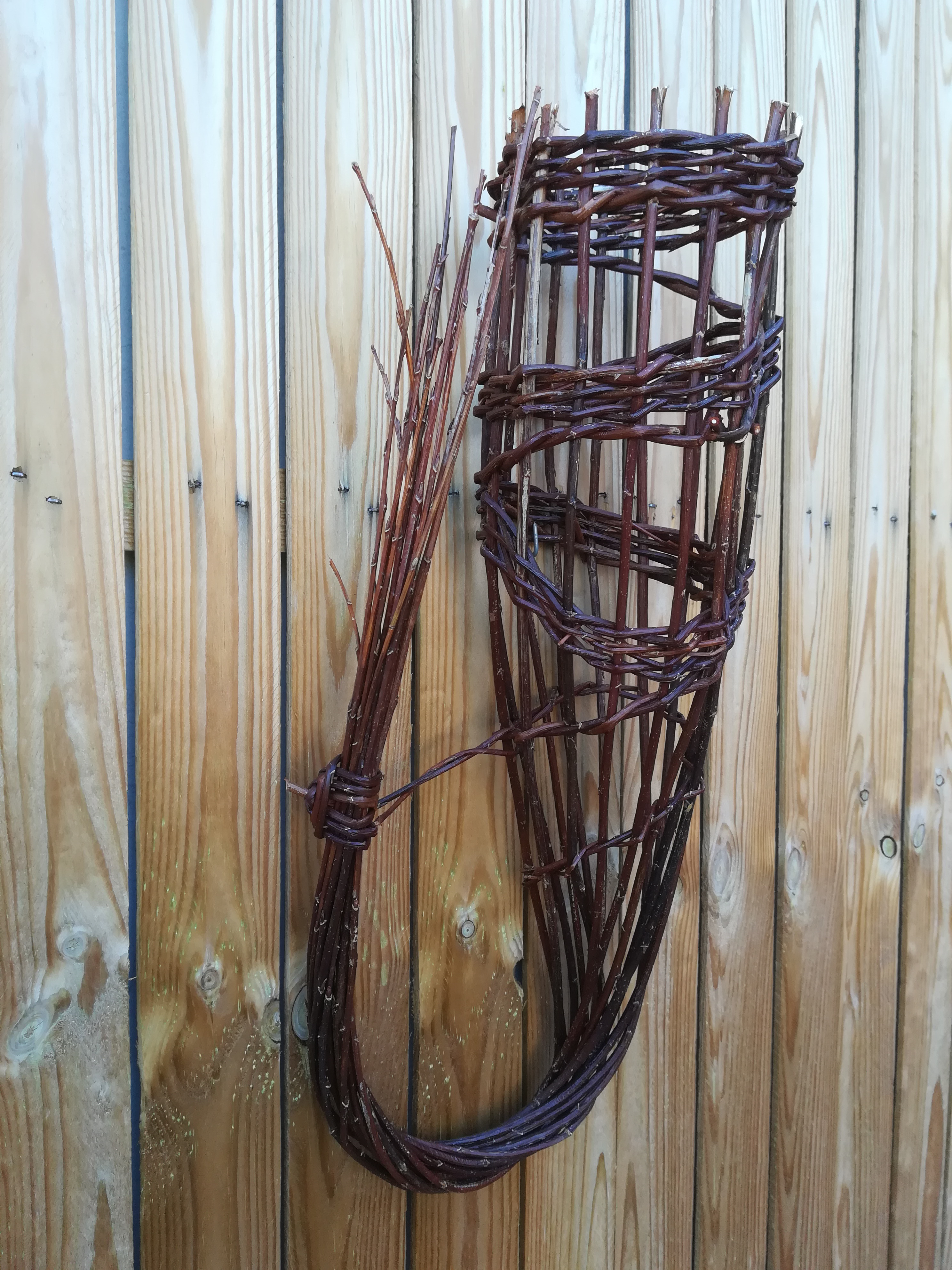 Voici mes deux premières petites corbeilles en tressage aléatoire avec de l’osier brut : une forme ovale avec un pied et une ronde avec une bordure, toutes deux faites à la maison de Fleury au bord du canal du Nivernais lors du stage de vannerie aléatoire avec Isabel Mc Garva.