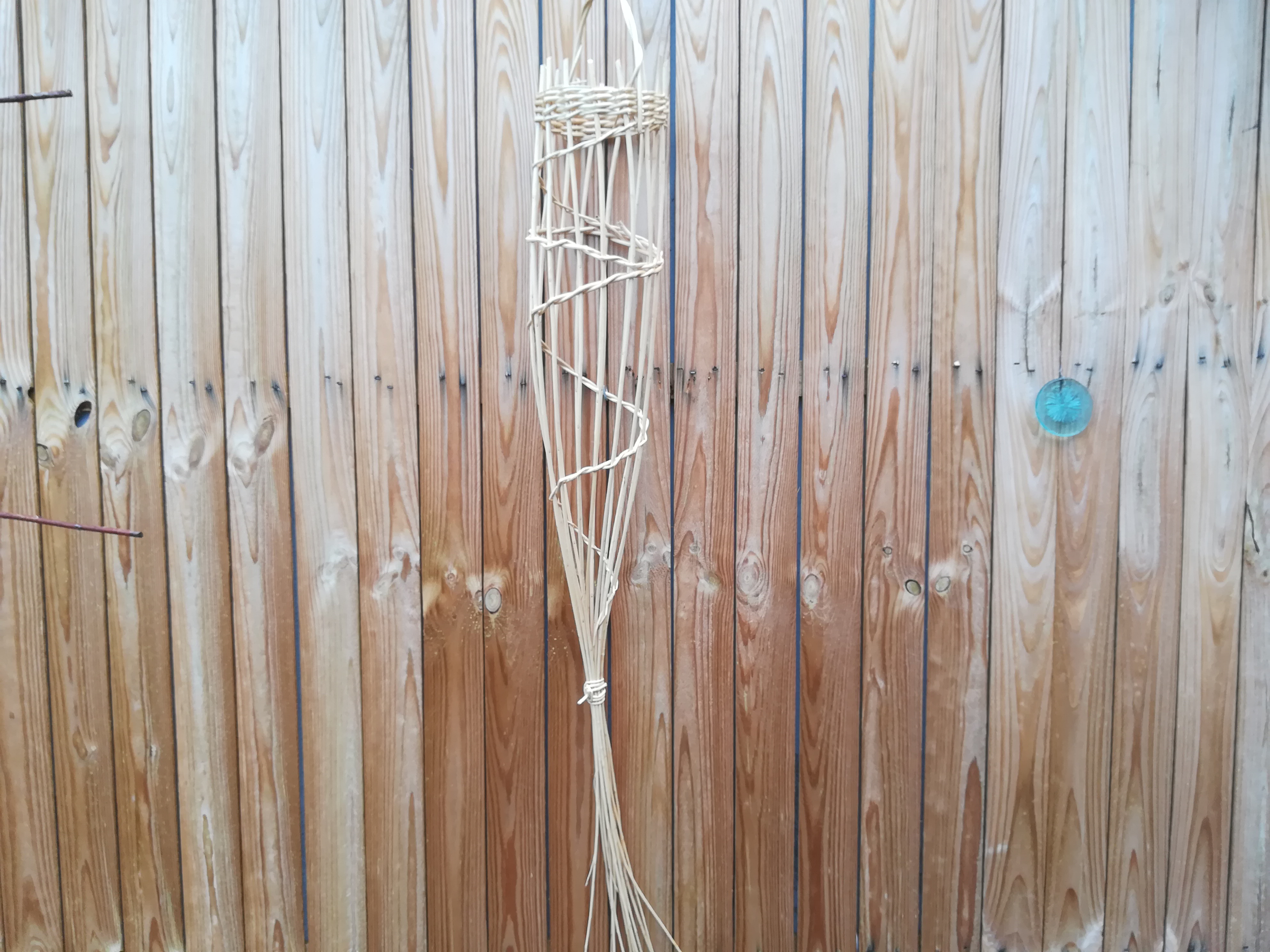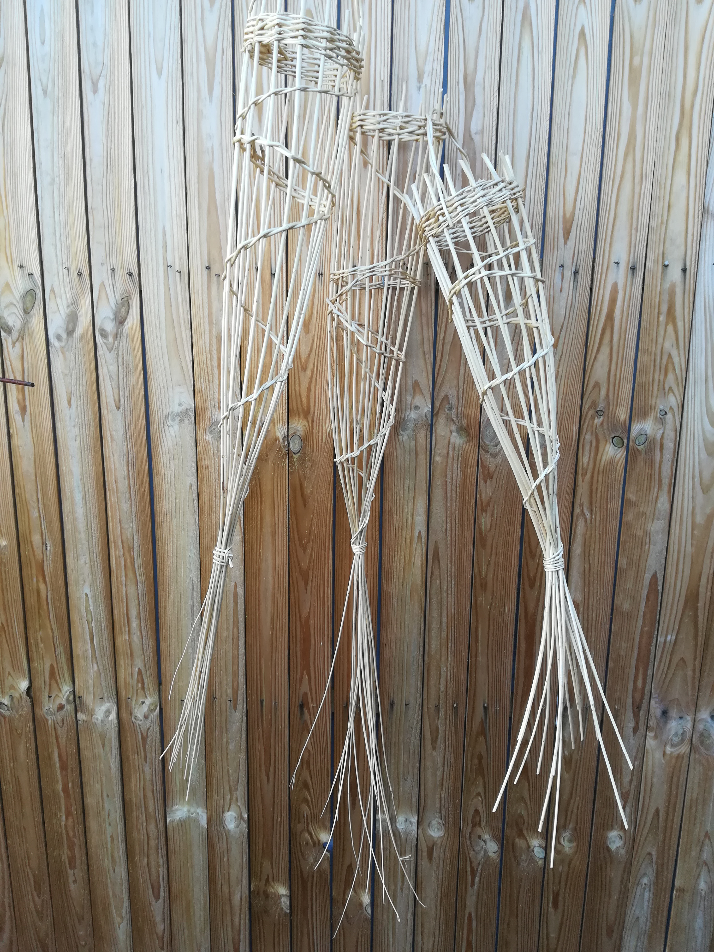 Hochets en osier blanc tressés avec la technique de vannerie du point du hochet.