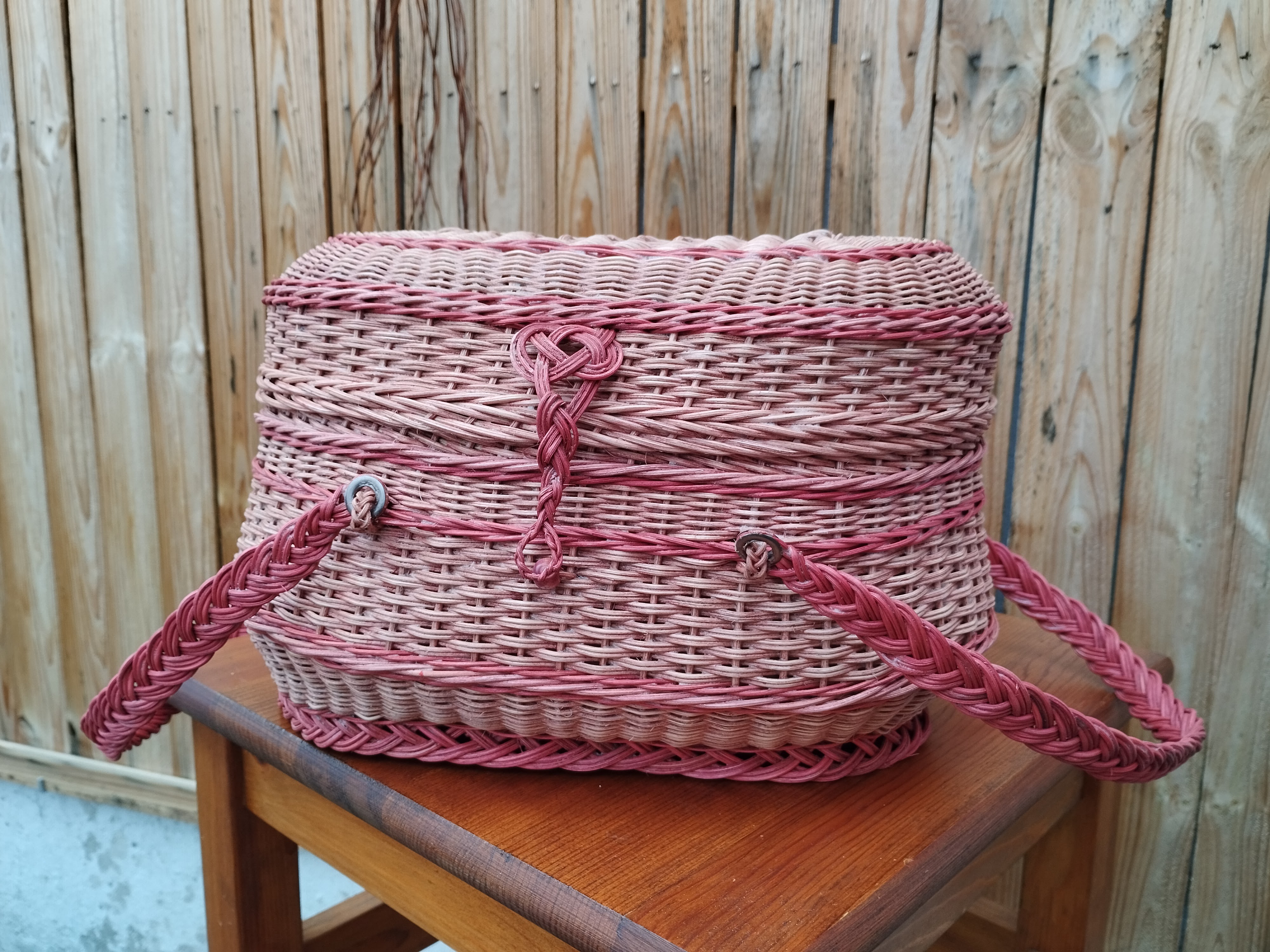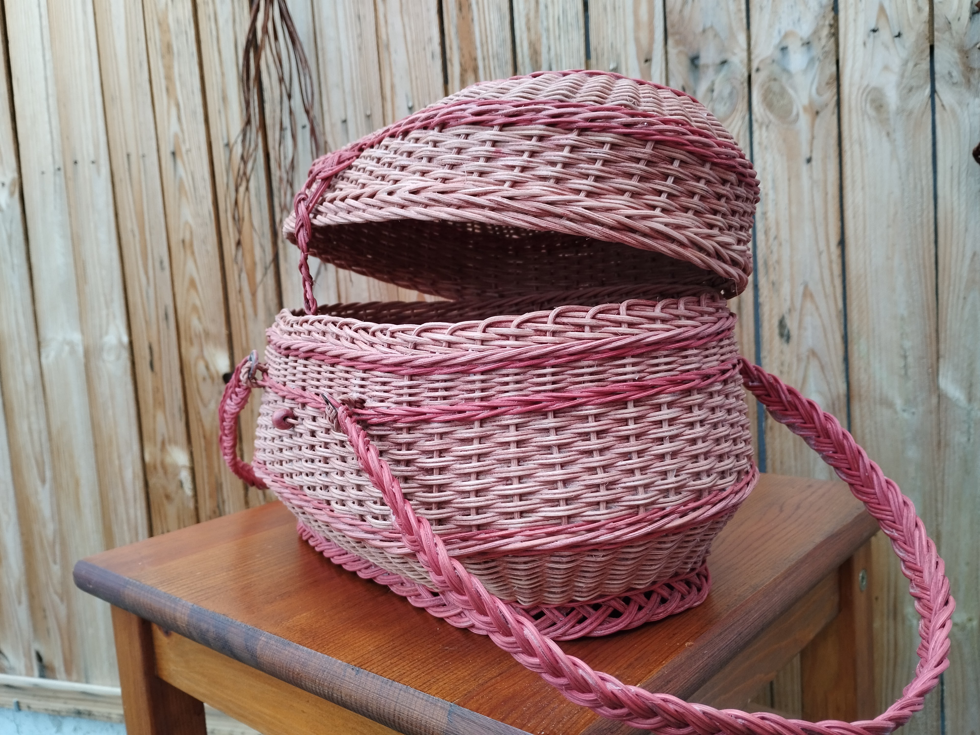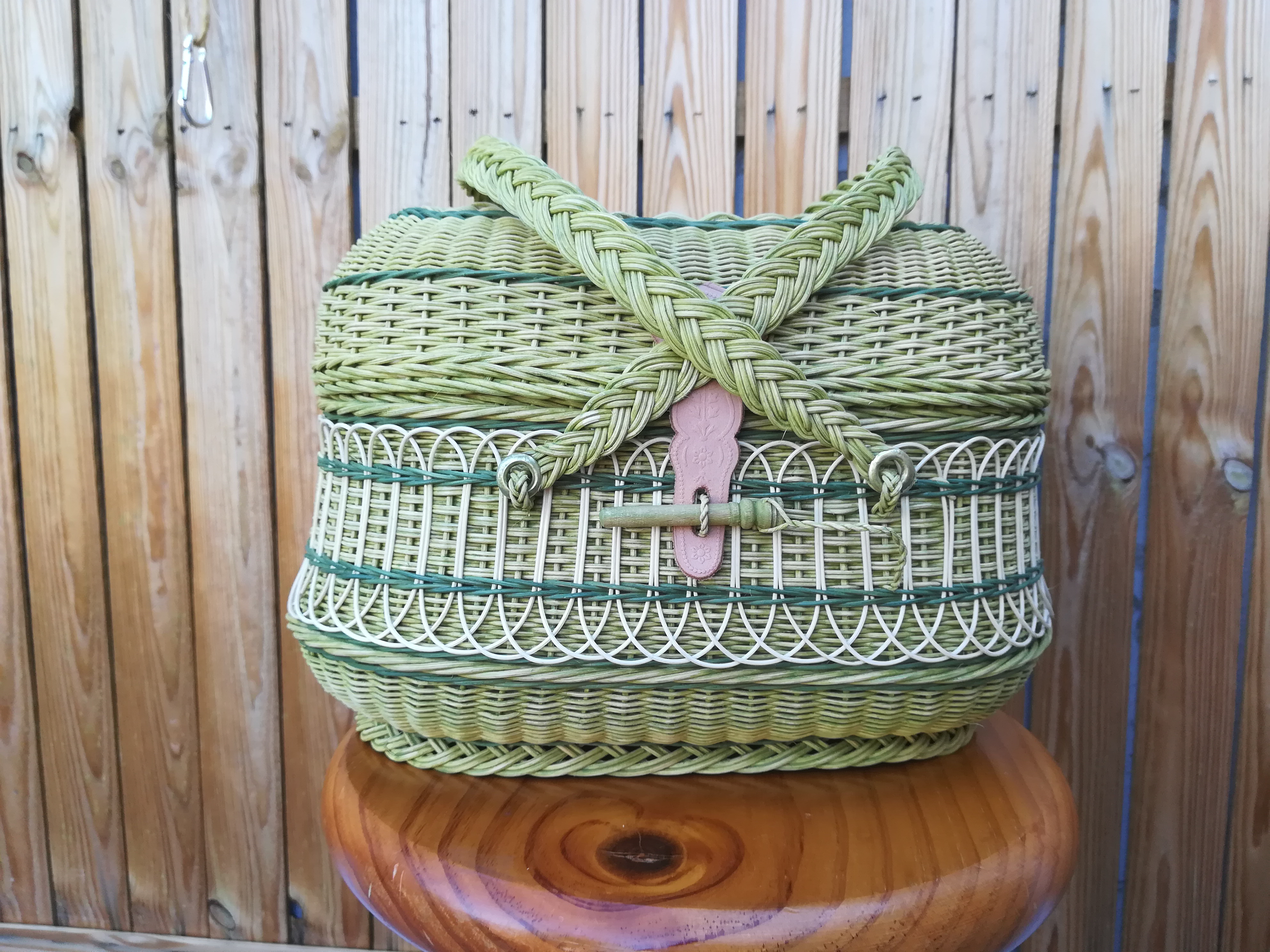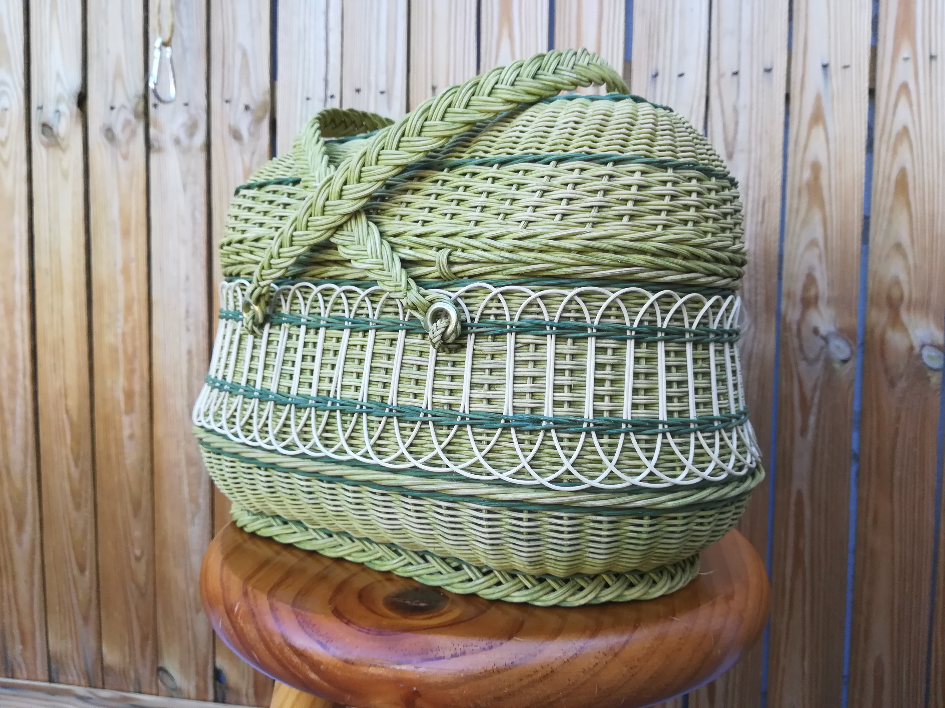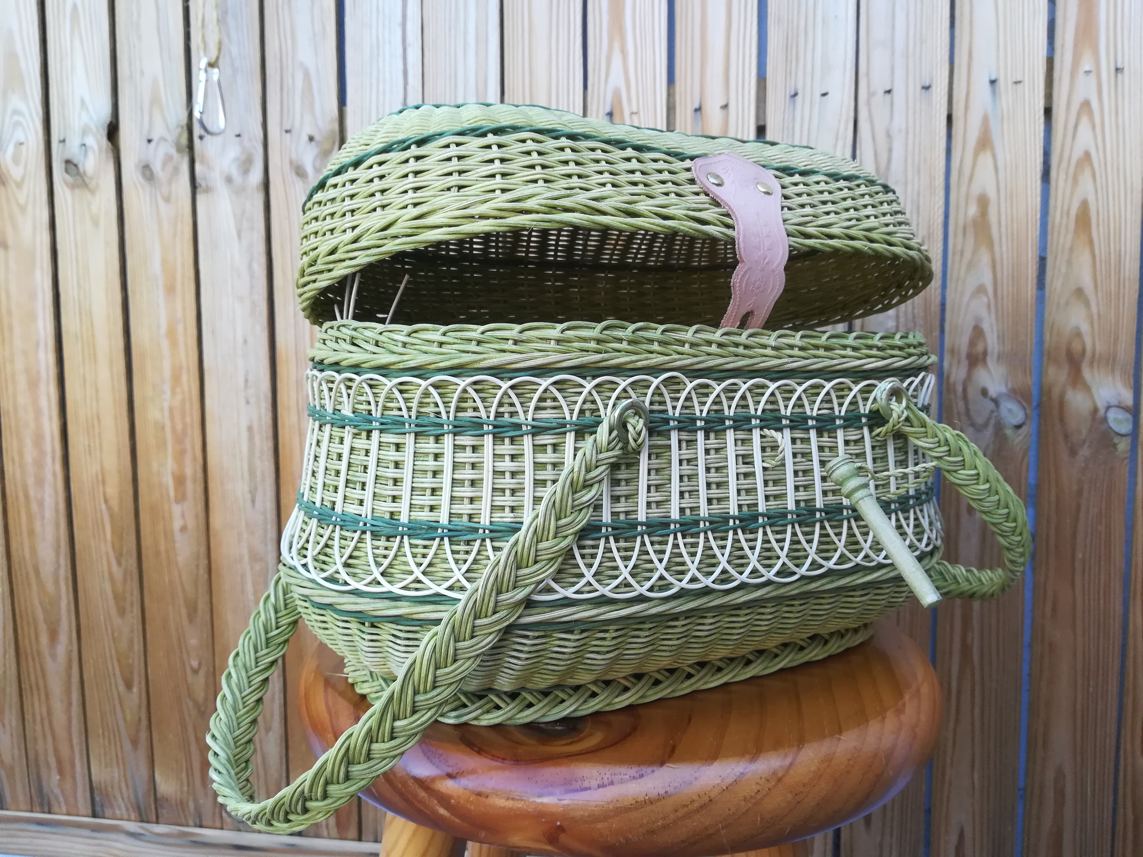 Première réalisation de panier rustique après le stage de l’été dernier. Tout en rotin, c’est un article de vannerie fine, tressé avec de la moelle de 1,5 et 2 mm. Par rapport au premier, j’ai échangé l’attache en cuir pour une en rotin et fermé le couvercle avec une perle plutôt qu’une goupille.